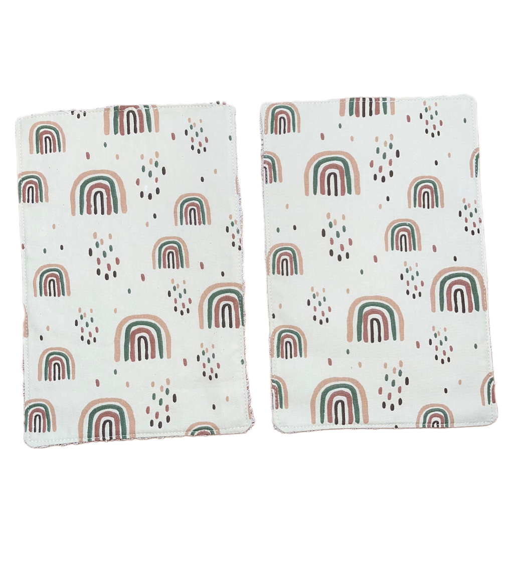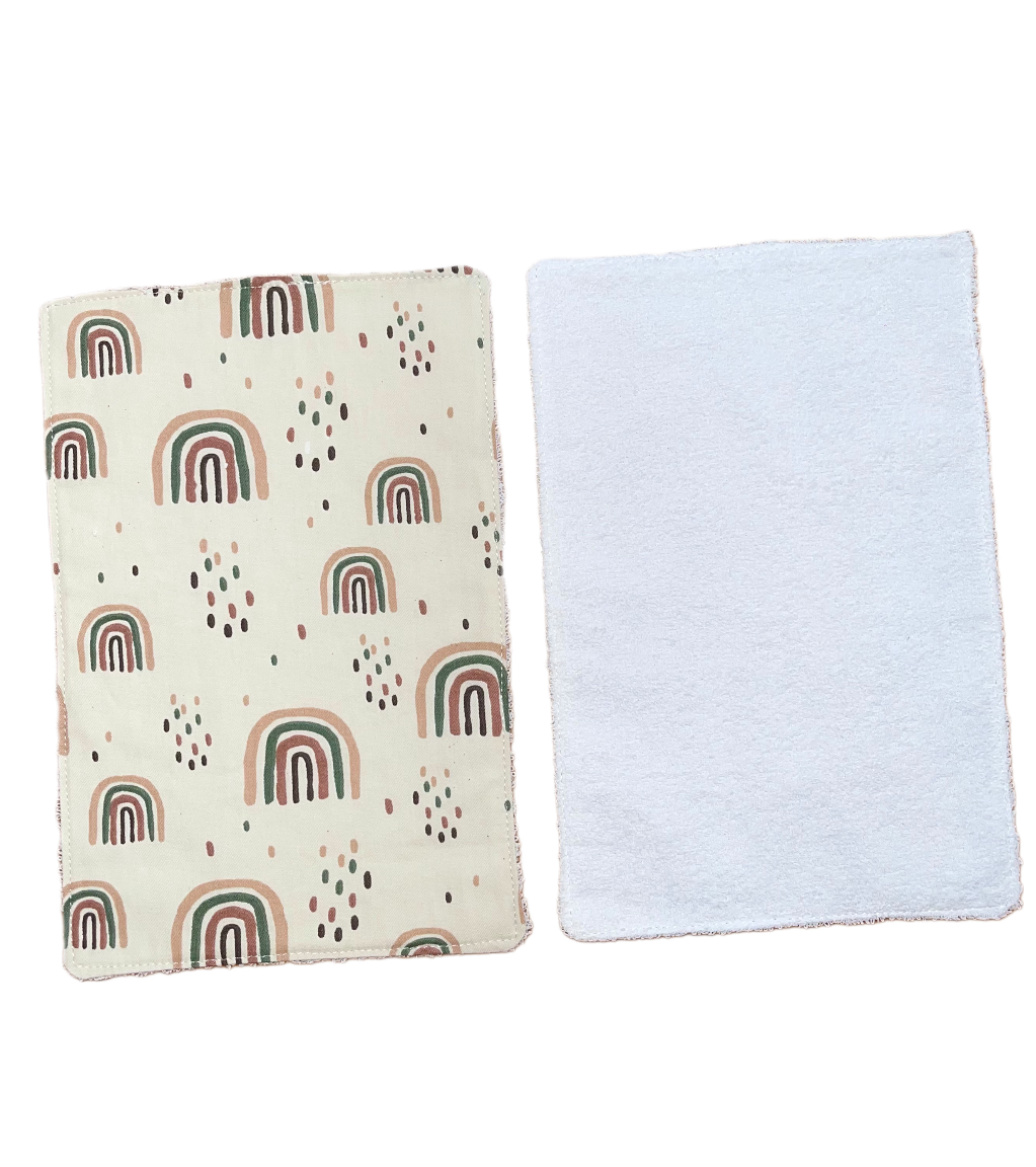 Babitas confeccionadas con 100% algodón, combinando gabardina estampada o tusor liso en el frente y toalla de algodón doble felpa en el reverso, ideales para acompañar los primeros meses del bebé.