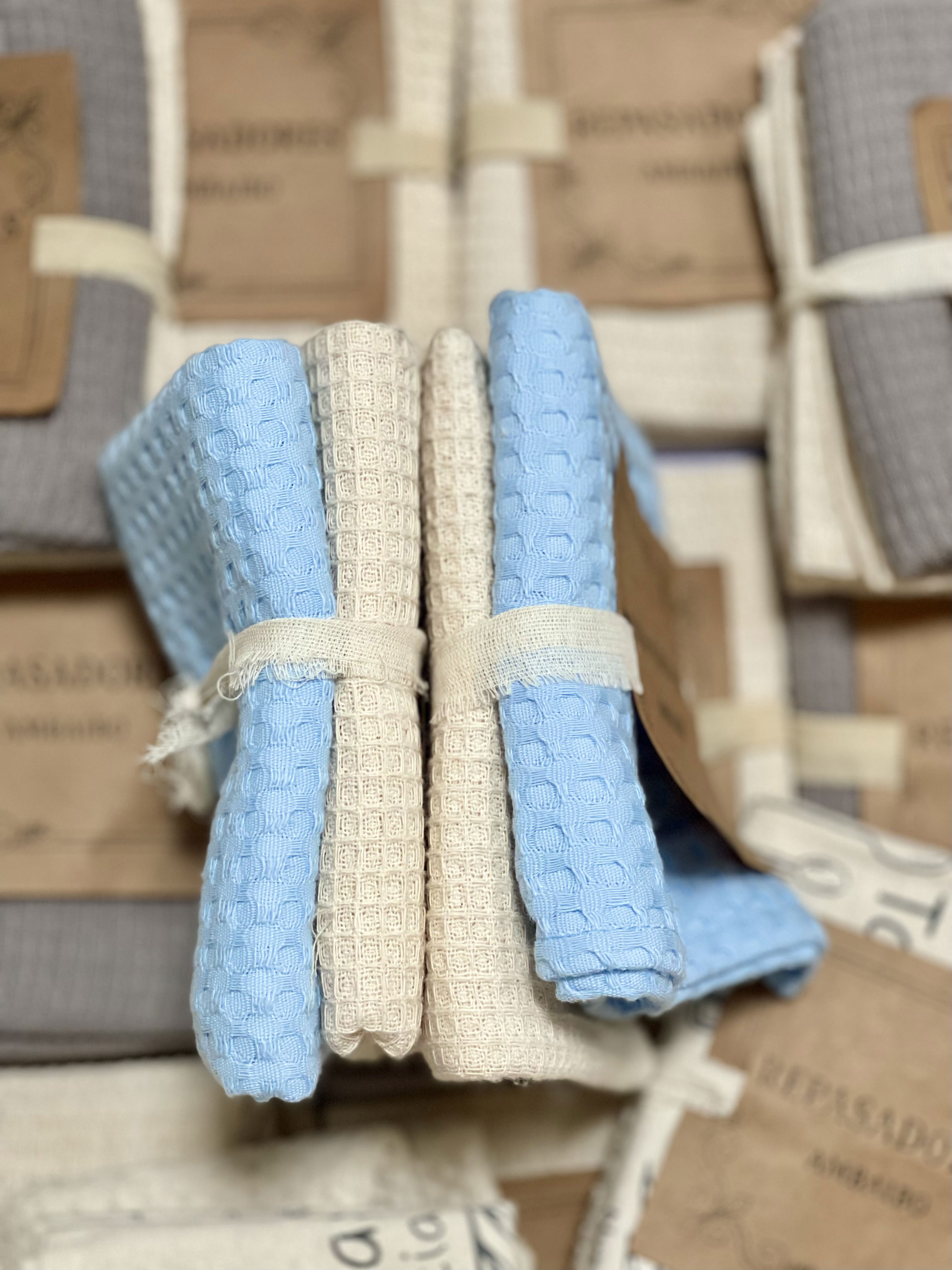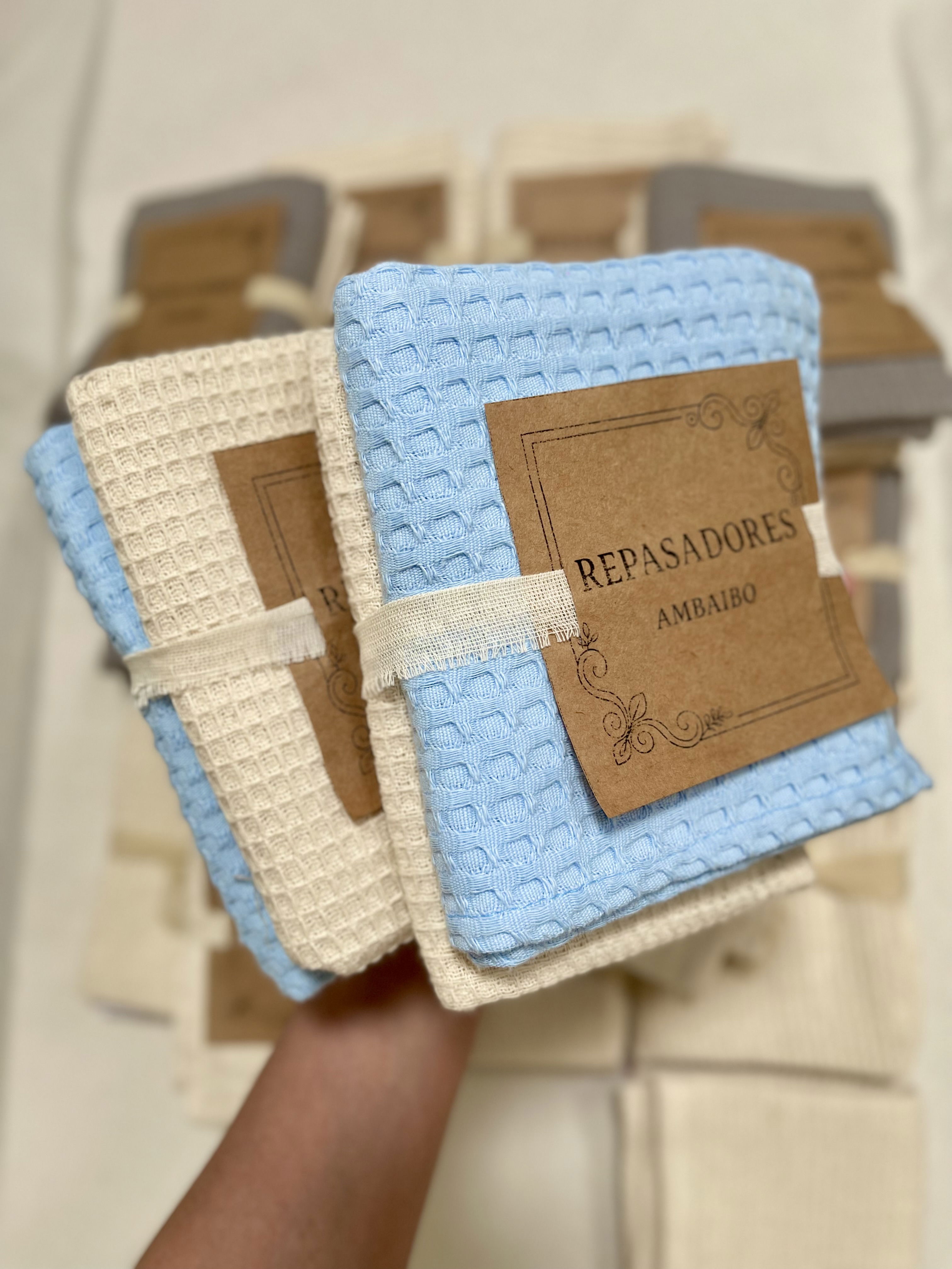 Este set incluye un repasador de nido de abeja color natural y celeste conocido por su gran capacidad de absorción y textura suave.