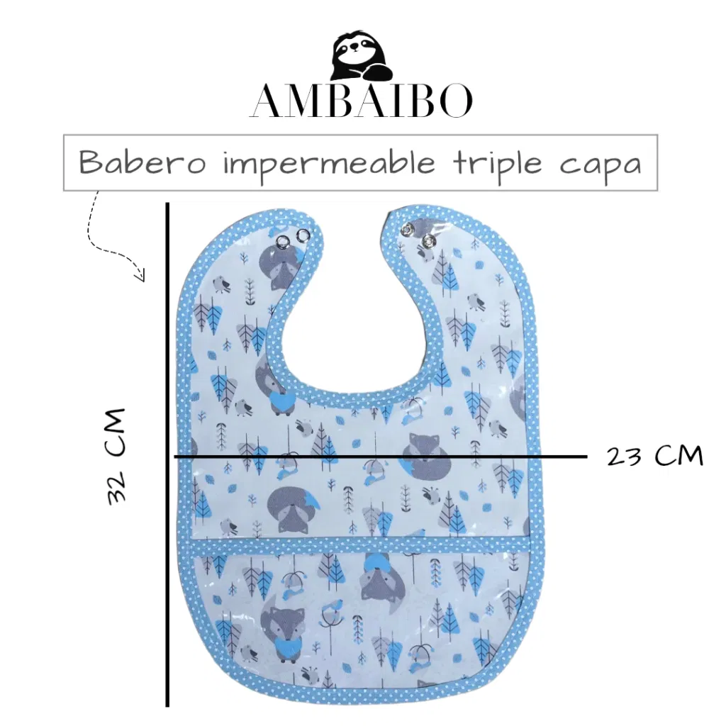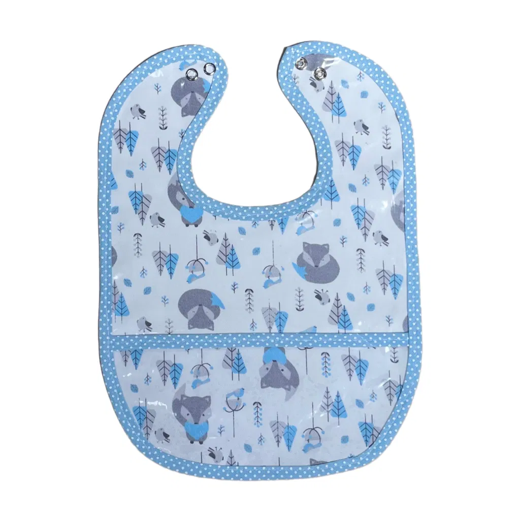 Babero ideal para la hora de la comida, diseñado con triple capa impermeable para evitar que mandas y liquidos traspasen. Cuenta con botones de metal para un ajuste seguro y duradero.