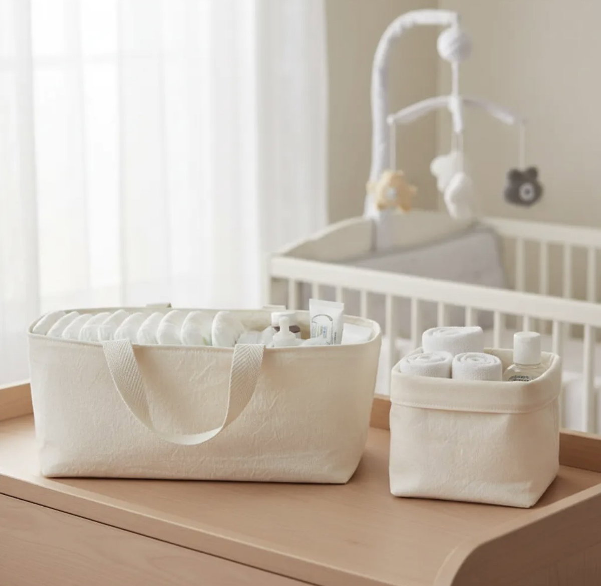 • Cesto de tela: Ideal para almacenar cremas, toallitas húmedas, talco y otros accesorios esenciales.
