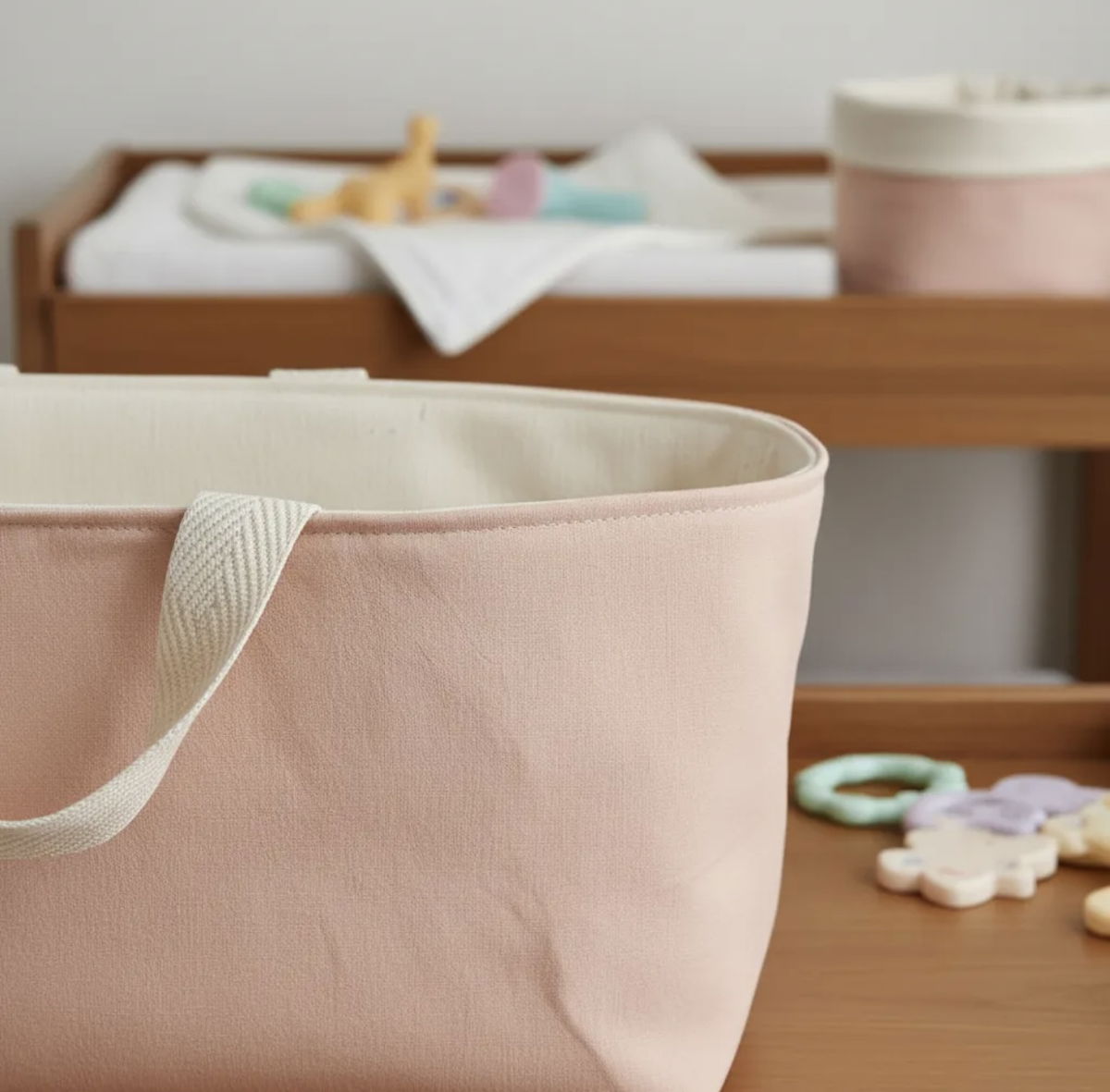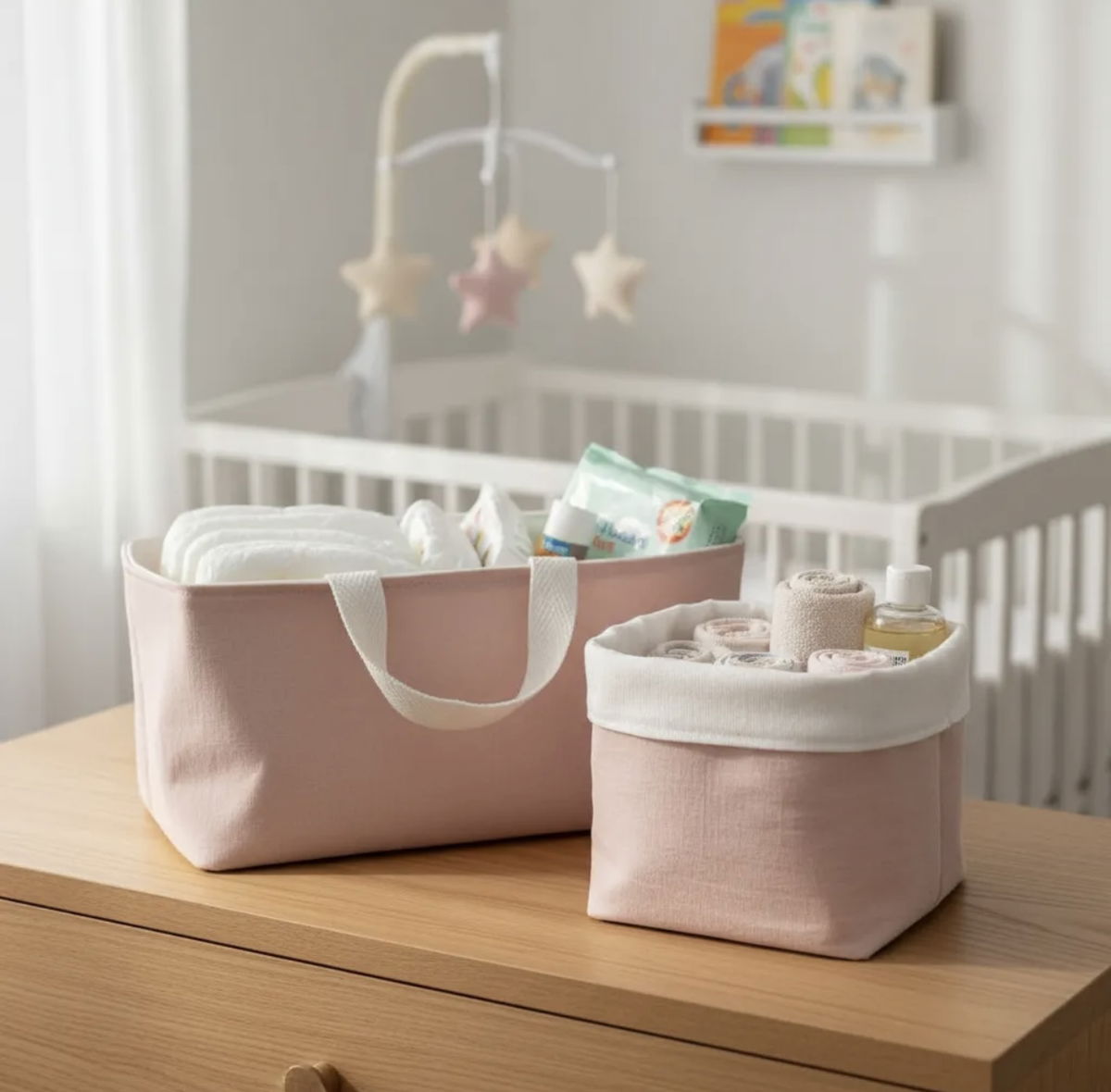 • Cesto de tela: Ideal para almacenar cremas, toallitas húmedas, talco y otros accesorios esenciales.
