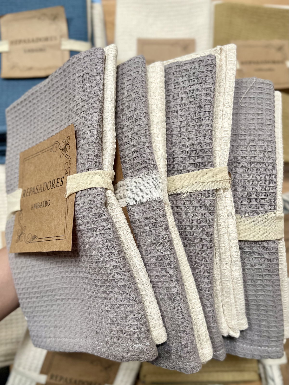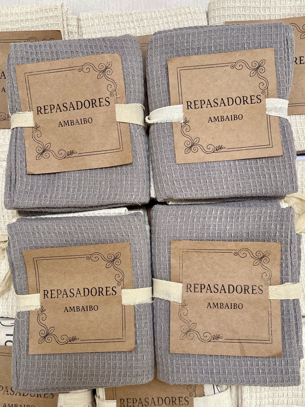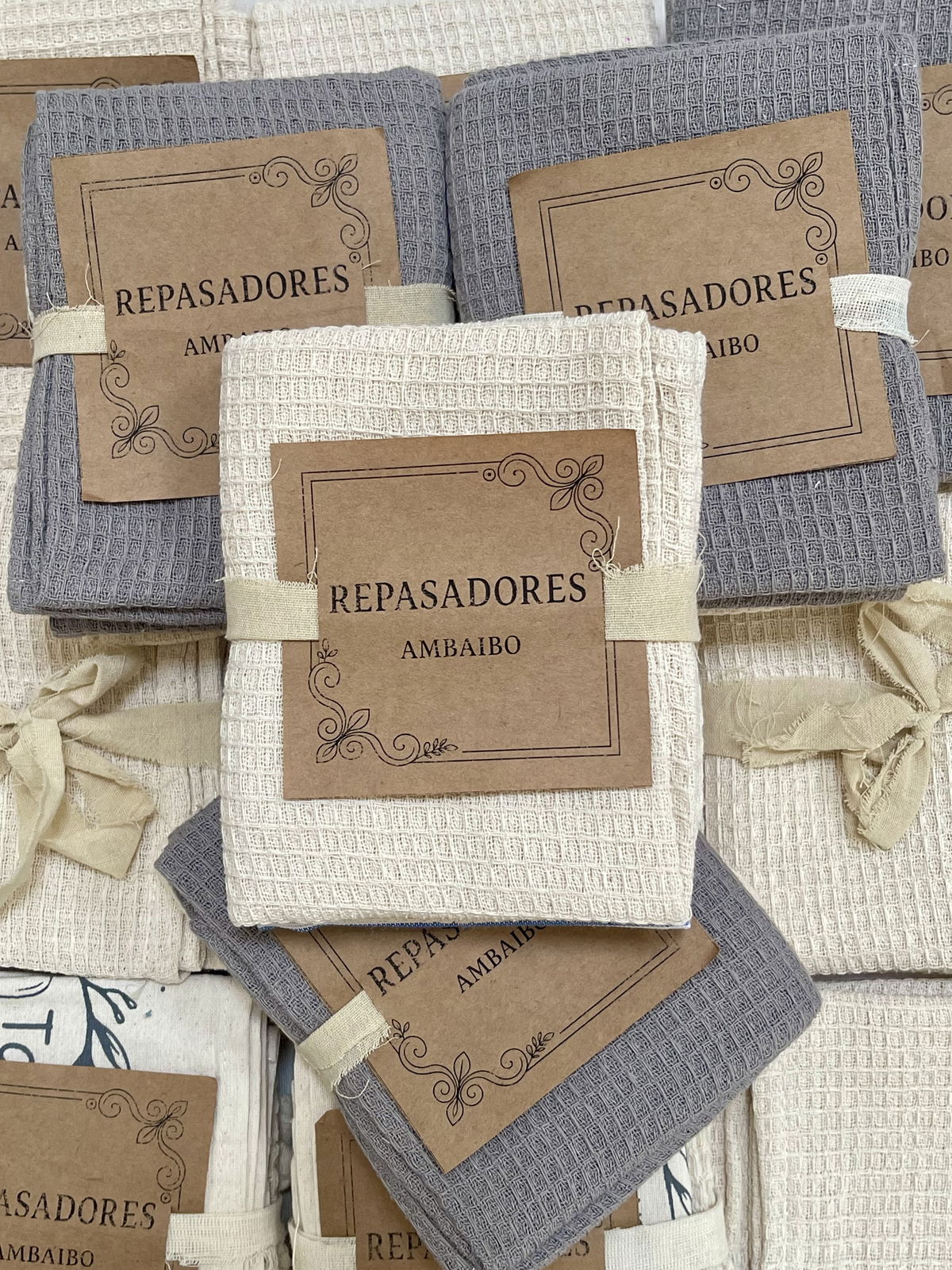 Este set incluye un repasador de nido de abeja color natural y gris conocido por su gran capacidad de absorción y textura suave.