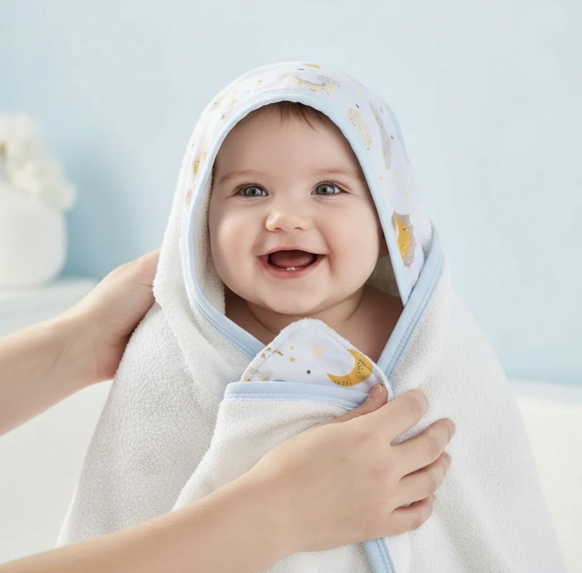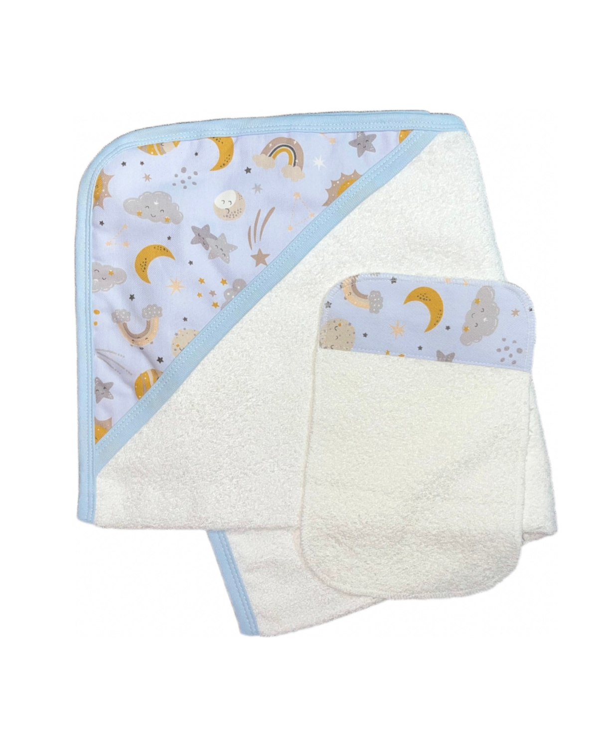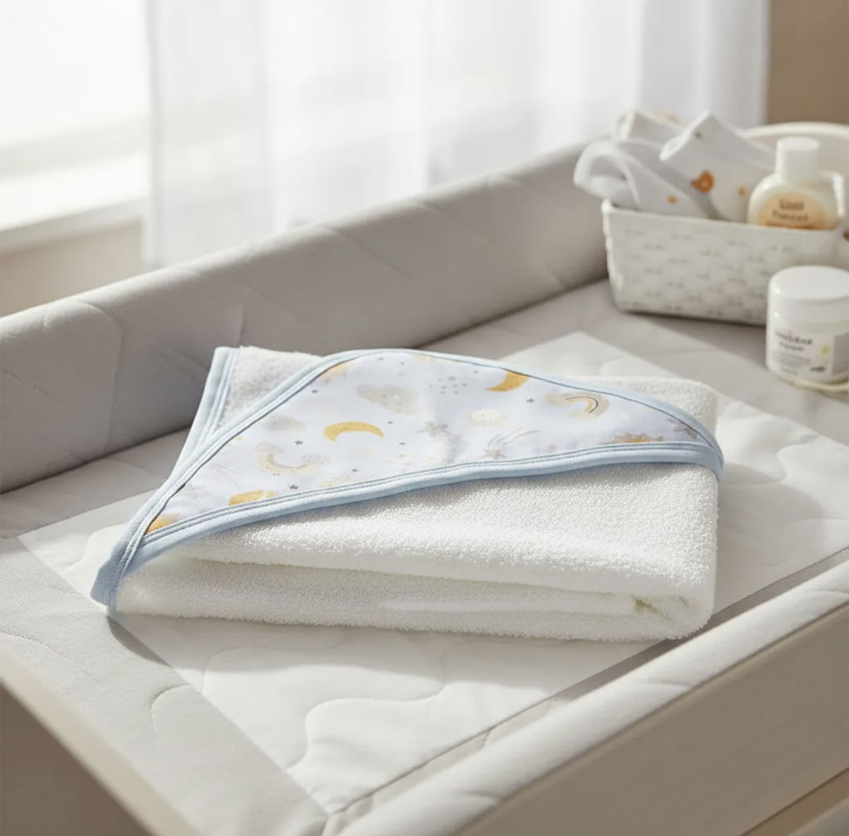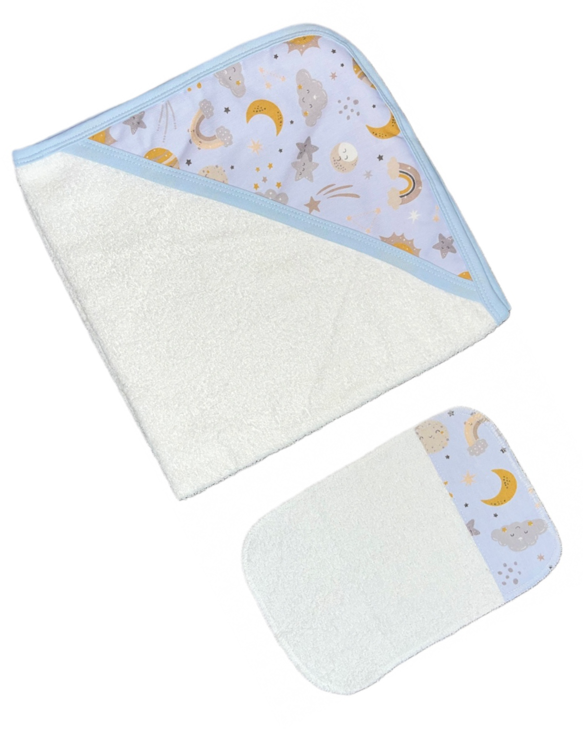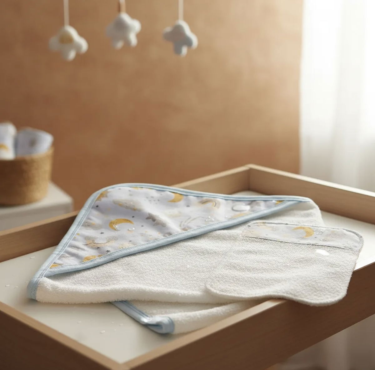 Ambas confeccionadas en toalla doble felpa suave y absorbente, ideales para la piel delicada del bebé.
