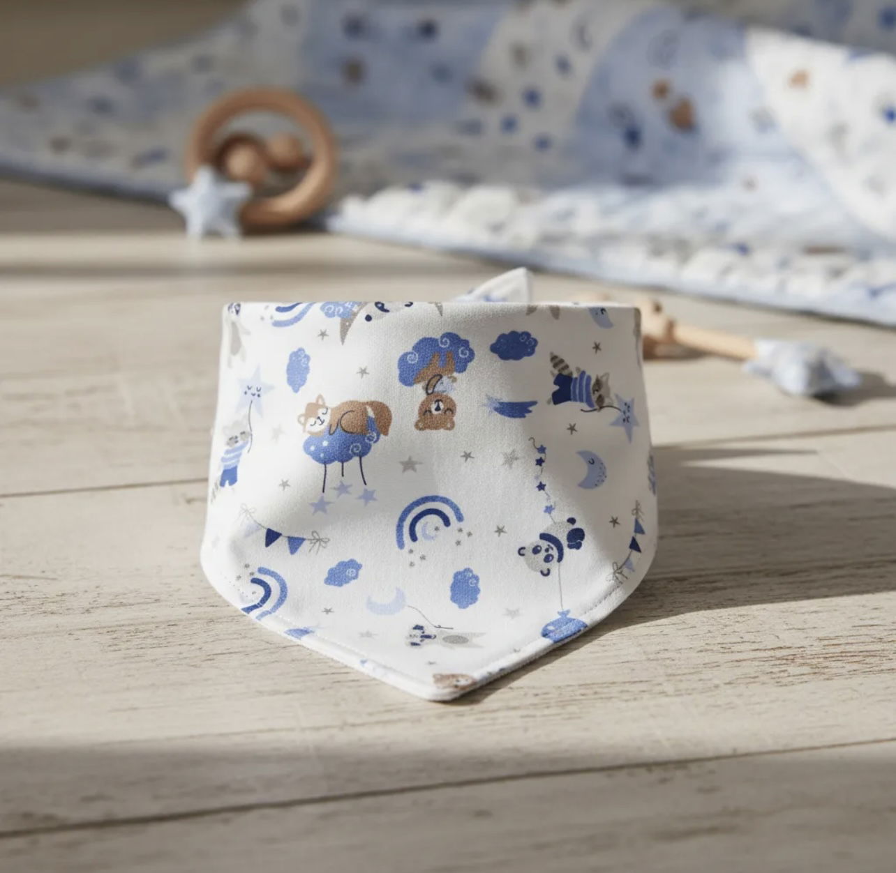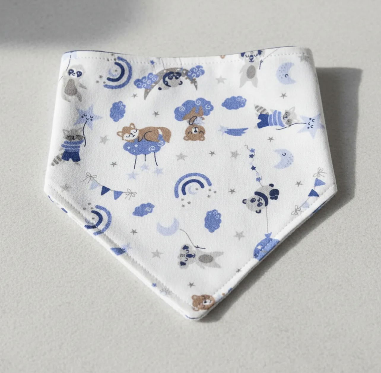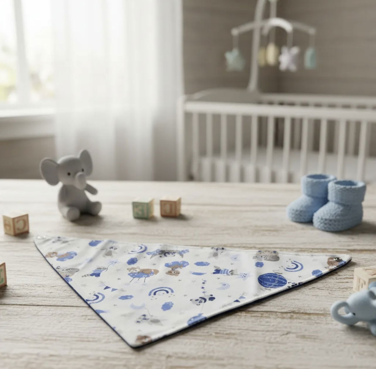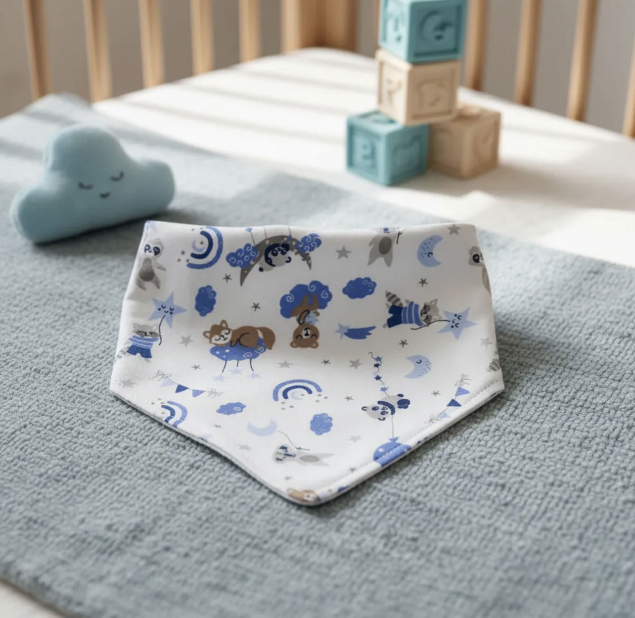 Babero bandana suave y cómodo, ideal para complementar el outfit del bebé. Cuenta con broche metálico para un ajuste práctico y seguro. Medidas aproximadas: 35 cm de ancho (de broche a broche) y 19 cm de alto.