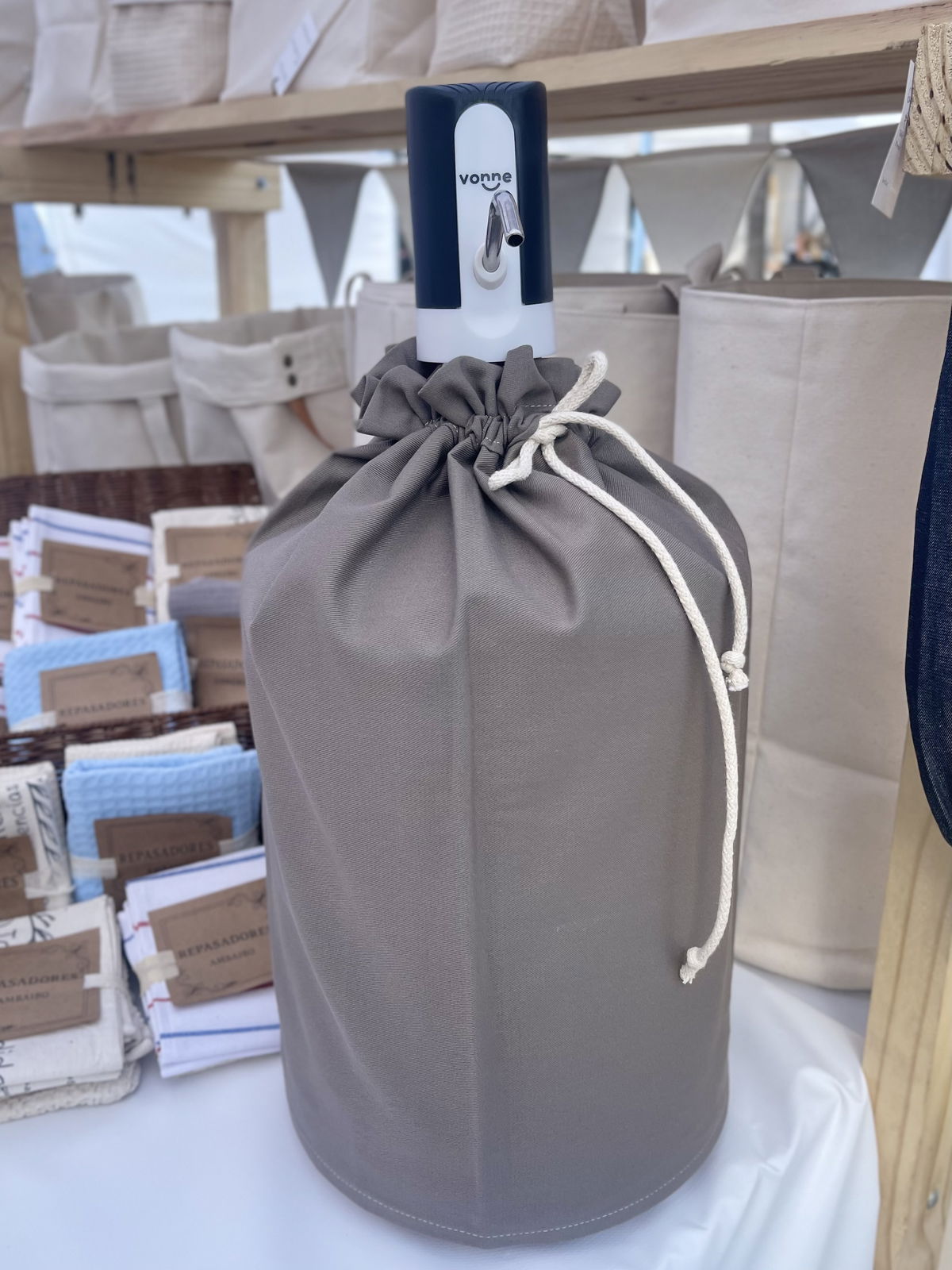 Su cierre ajustable con cordón permite una colocación sencilla y un acabado prolijo. Ideal para quienes buscan mantener su dispenser ordenado y con un toque natural.