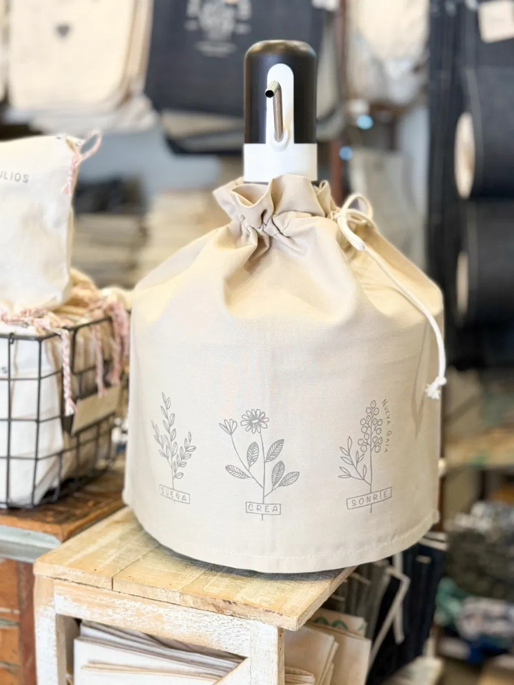 Diseñada para bidones de 12 litros, esta funda combina funcionalidad y diseño para mantener tu dispenser siempre prolijo y decorativo. Confeccionada en tela color arena con estampa botánica en tono gris, invita a llenar los espacios de calma y armonía.