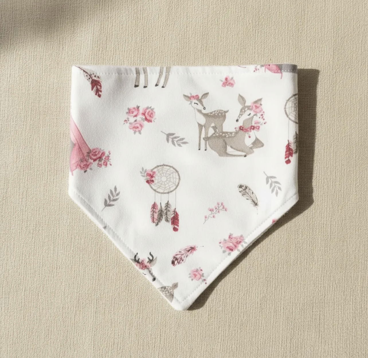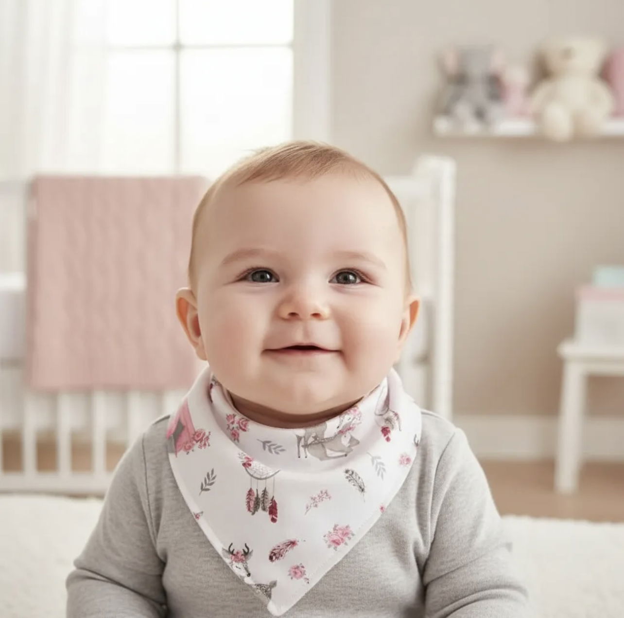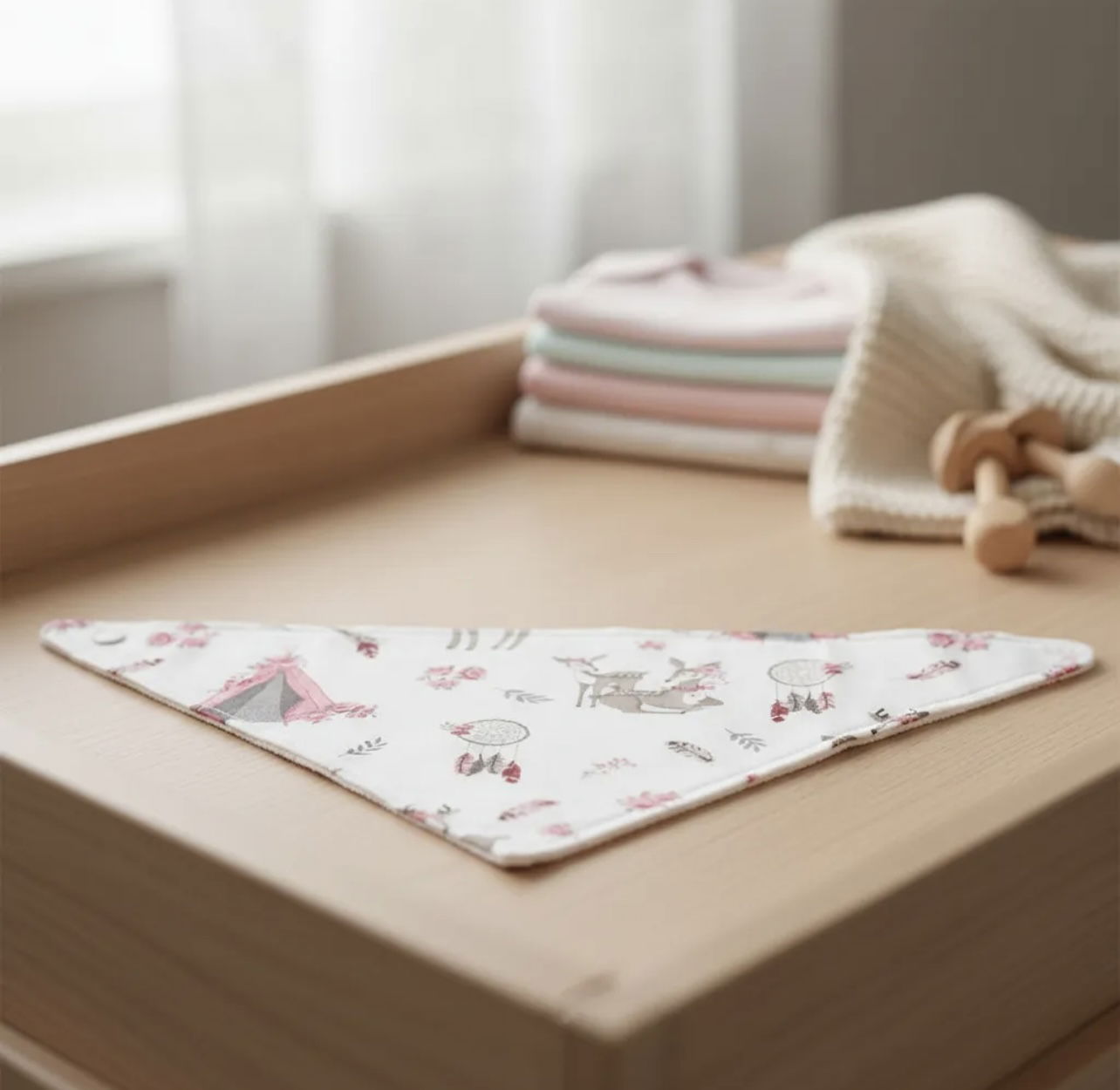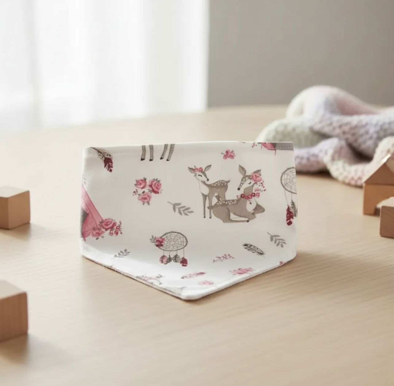 Babero bandana suave y cómodo, ideal para complementar el outfit del bebé. Cuenta con broche metálico para un ajuste práctico y seguro. Medidas aproximadas: 35 cm de ancho (de broche a broche) y 19 cm de alto.