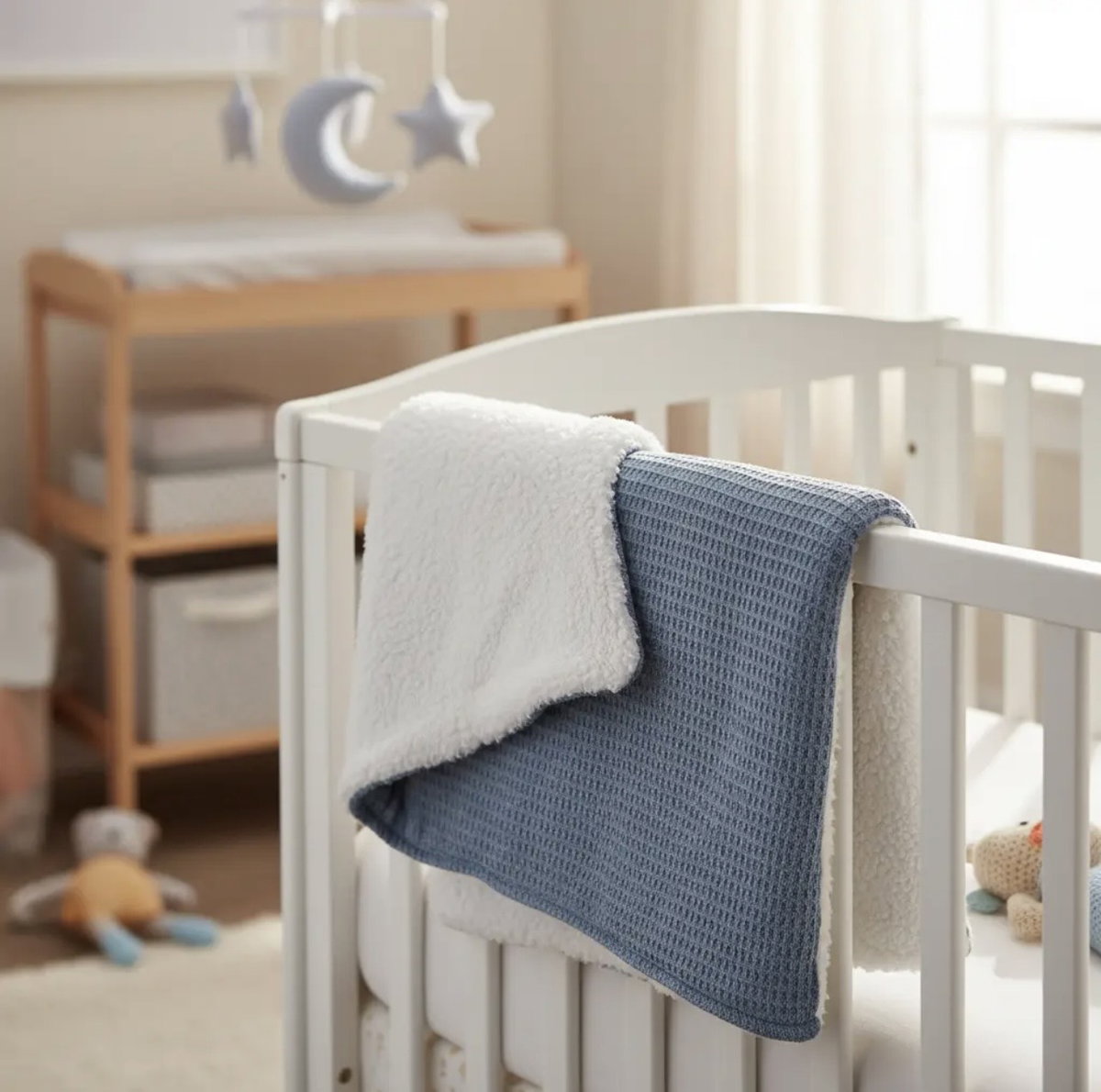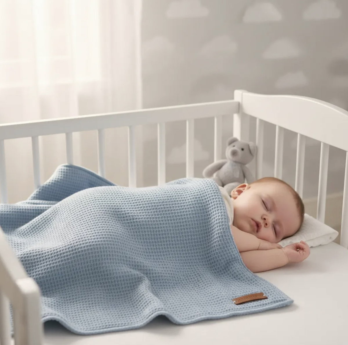 Nuestra manta de 80x100 cm combina la suavidad del corderito con la textura del tejido waffle, también conocido como nido de abeja. Hecha de 100% algodón, esta manta es ideal para mantener al bebé abrigado y cómodo. Perfecta para usar en la cuna o el cochecito, ofrece una calidez acogedora y una textura agradable al tacto, siendo un complemento versátil y esencial para el cuidado diario del bebé.