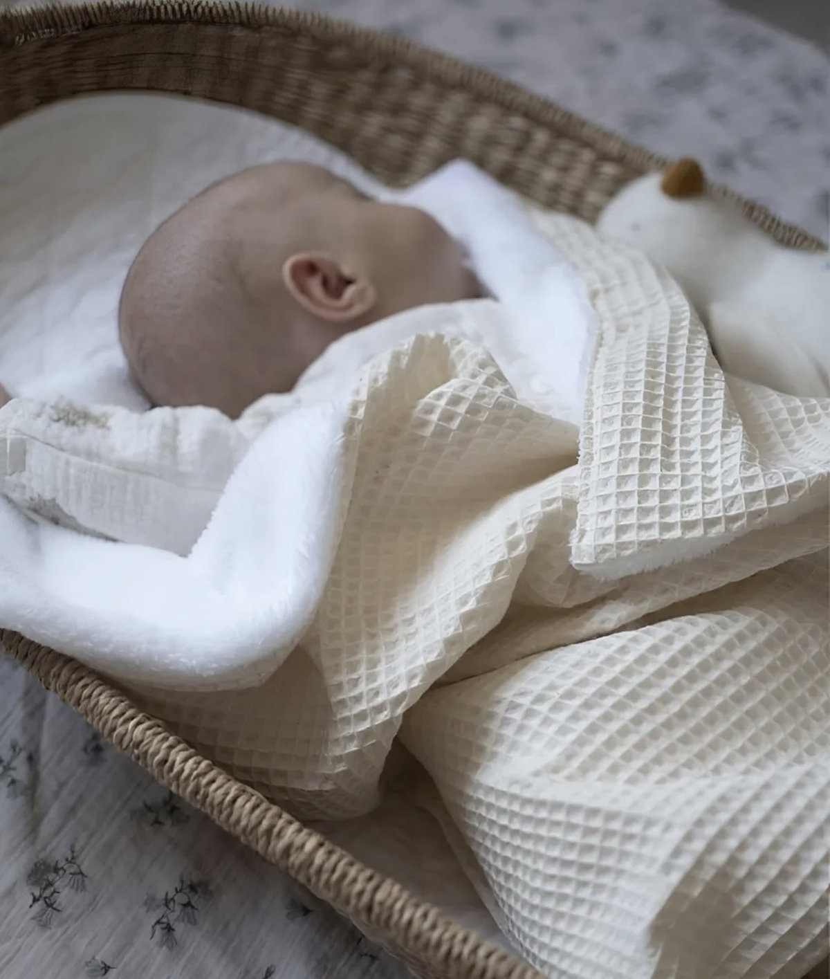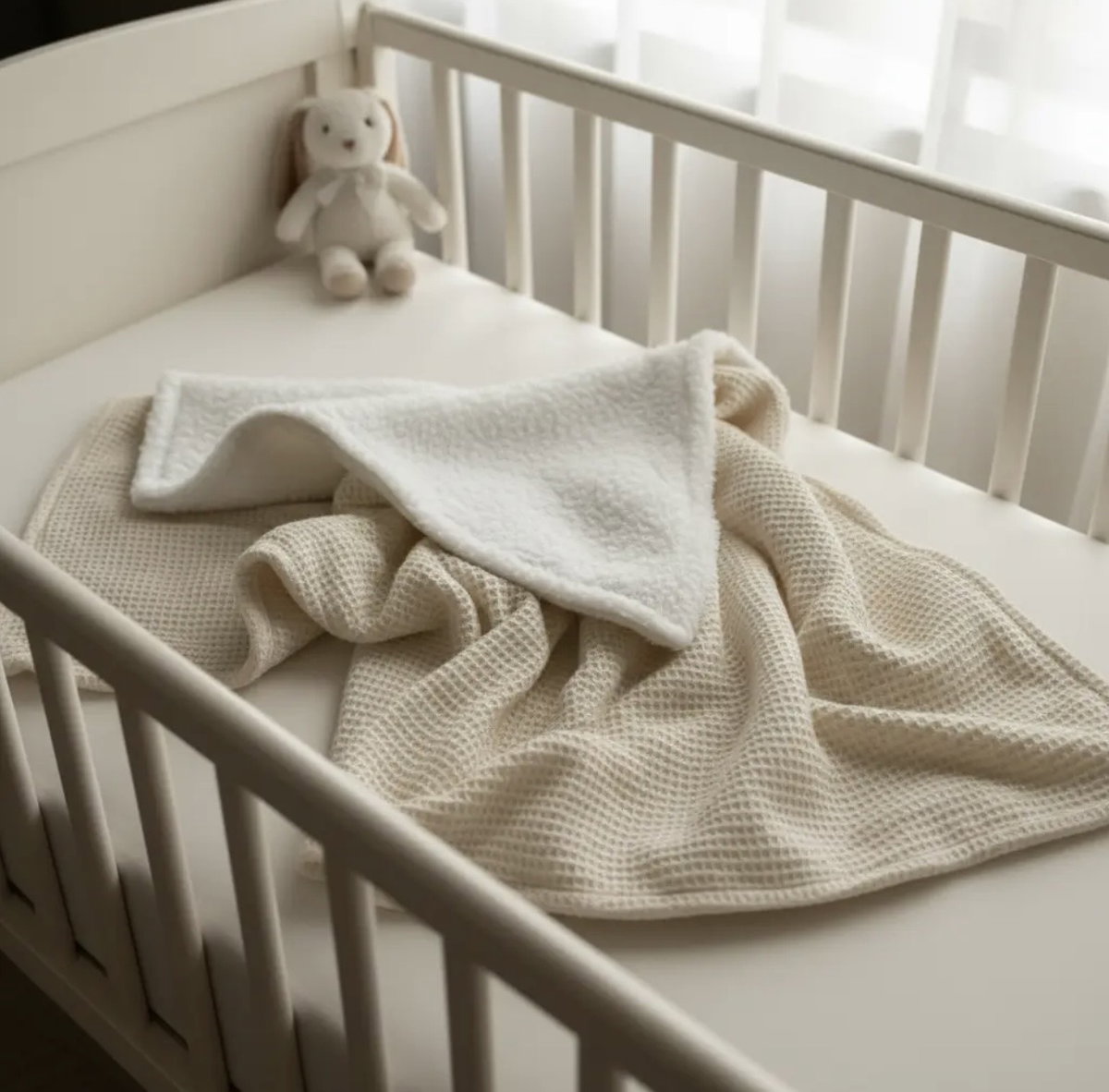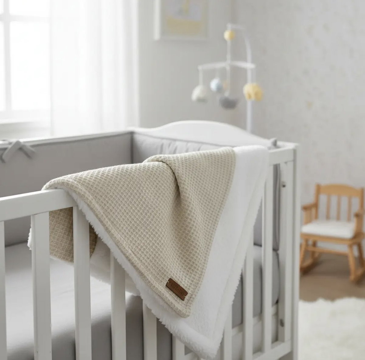 Nuestra manta de 80x100 cm combina la suavidad del corderito con la textura del tejido waffle, también conocido como nido de abeja. Hecha de 100% algodón, esta manta es ideal para mantener al bebé abrigado y cómodo. Perfecta para usar en la cuna o el cochecito, ofrece una calidez acogedora y una textura agradable al tacto, siendo un complemento versátil y esencial para el cuidado diario del bebé.