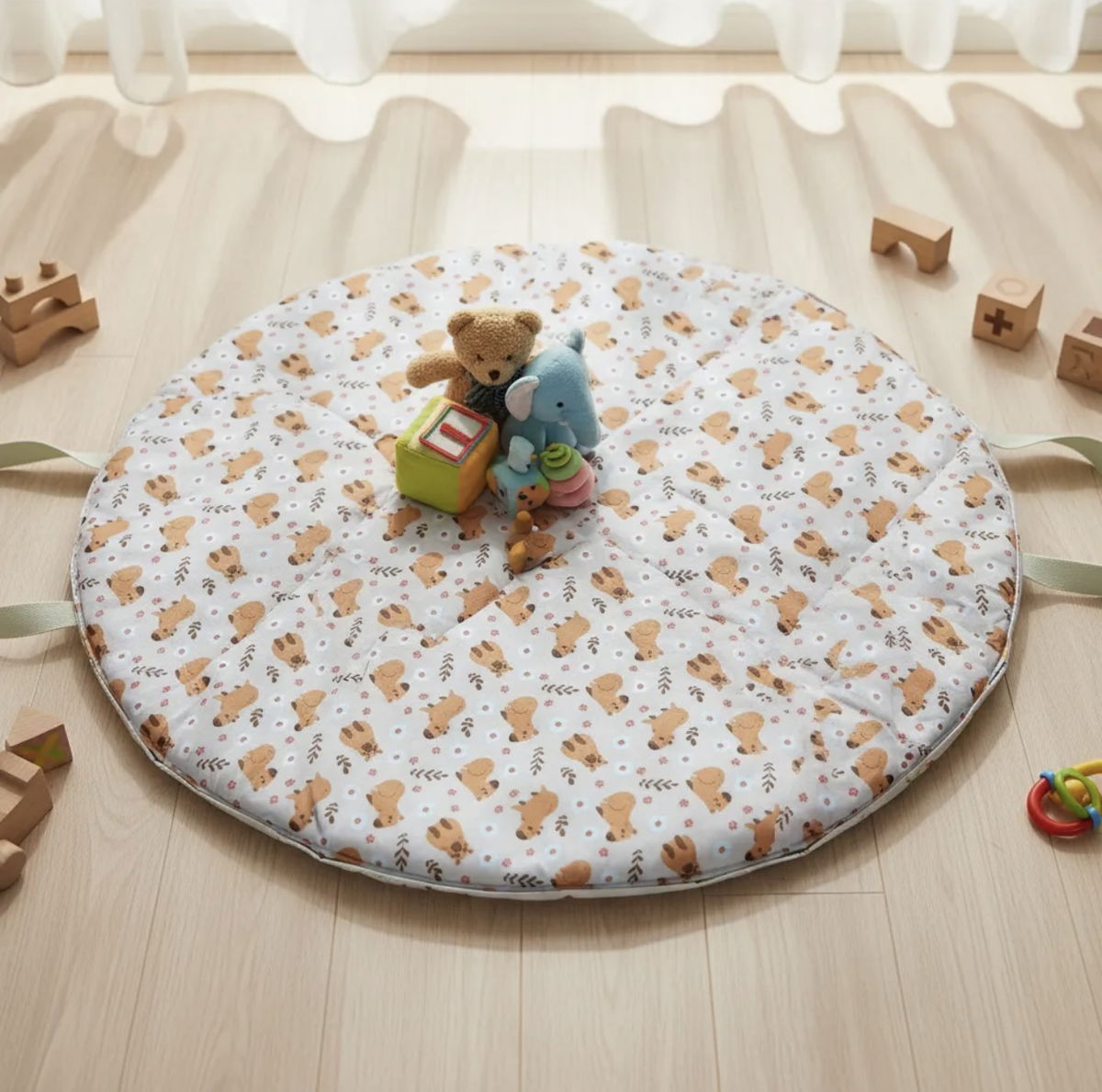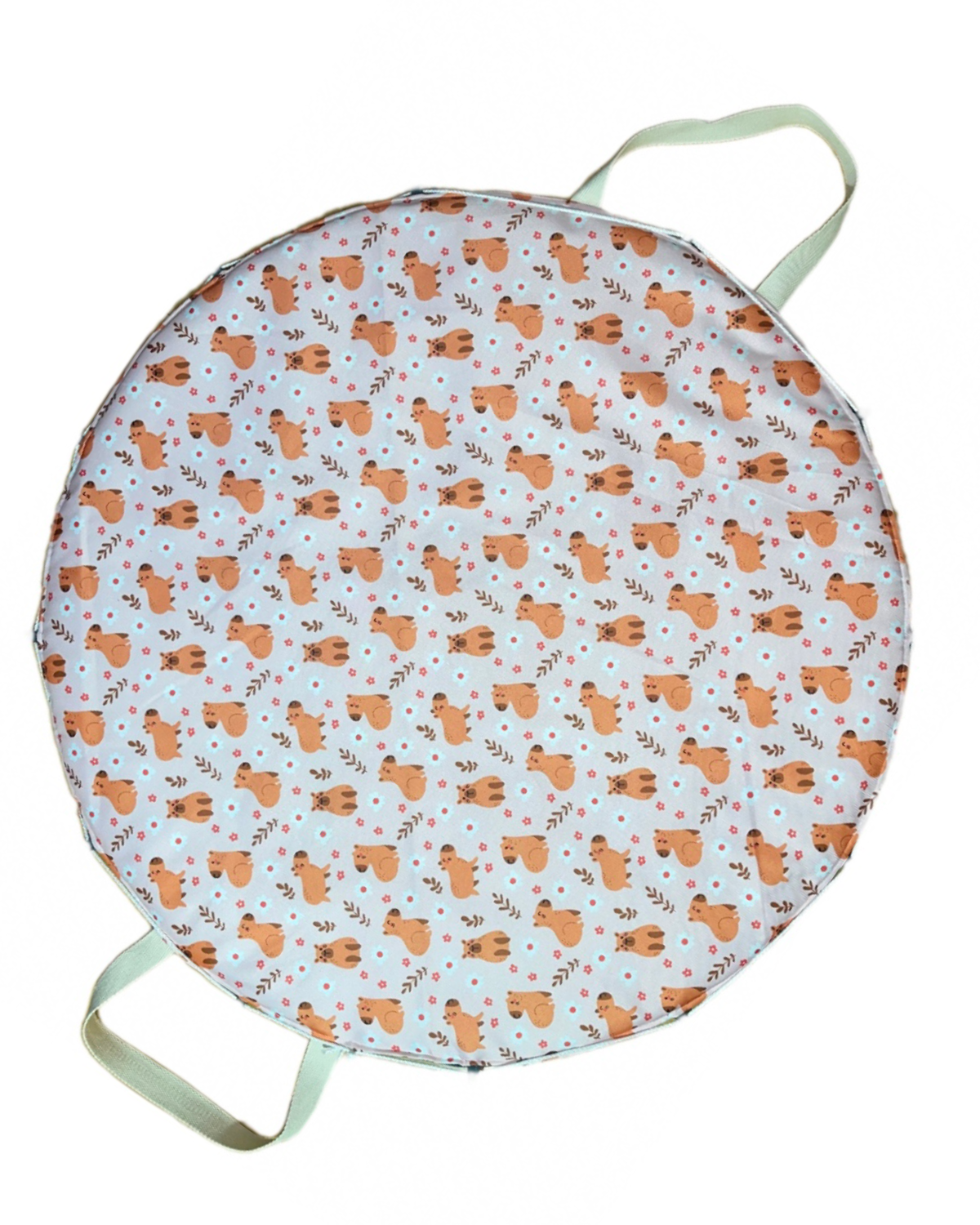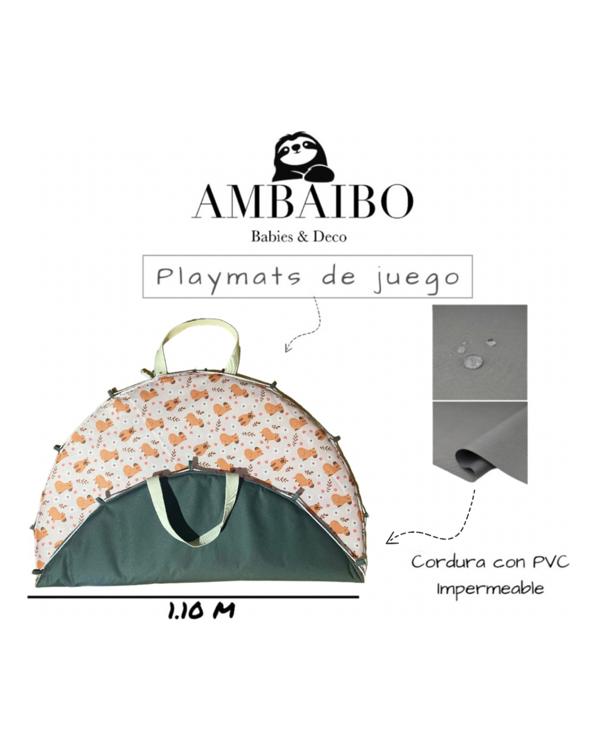 Nuestra Playmat es la opción ideal para acompañarte en cada paseo o momento de juego. Su diseño 2 en 1 te permite usarla como una cómoda alfombra para tu bebé y, al tirar del cordón, transformarla fácilmente en un bolso para guardar juguetes, mantas o accesorios.