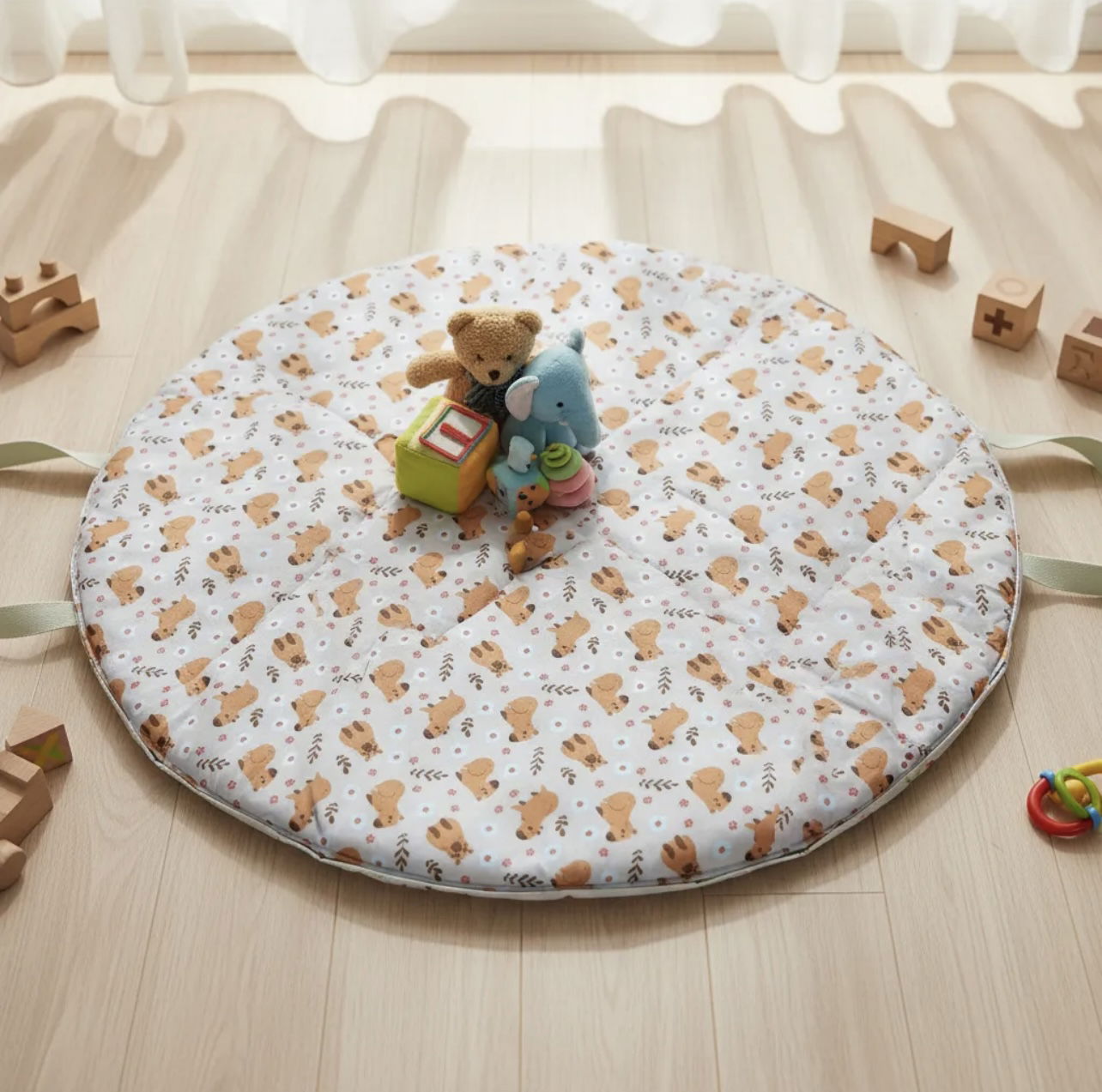 Nuestra Playmat es la opción ideal para acompañarte en cada paseo o momento de juego. Su diseño 2 en 1 te permite usarla como una cómoda alfombra para tu bebé y, al tirar del cordón, transformarla fácilmente en un bolso para guardar juguetes, mantas o accesorios.