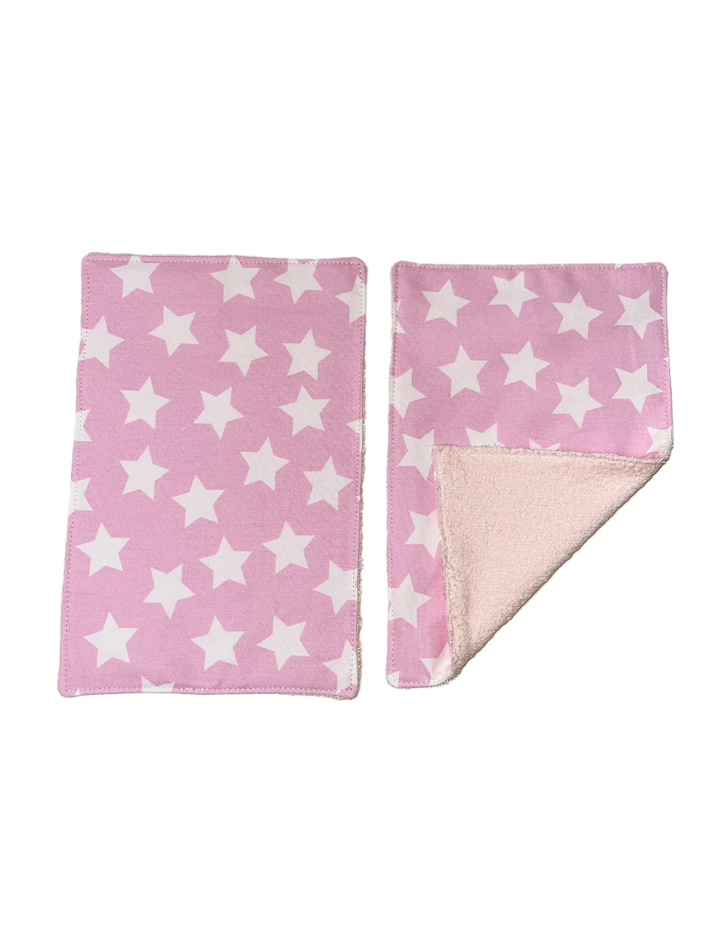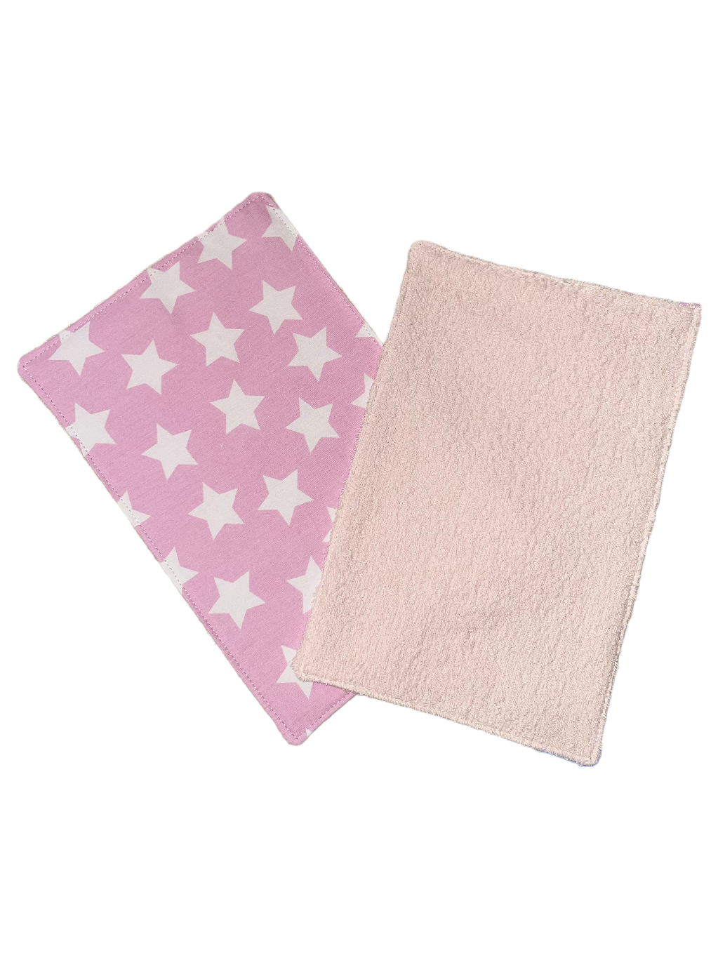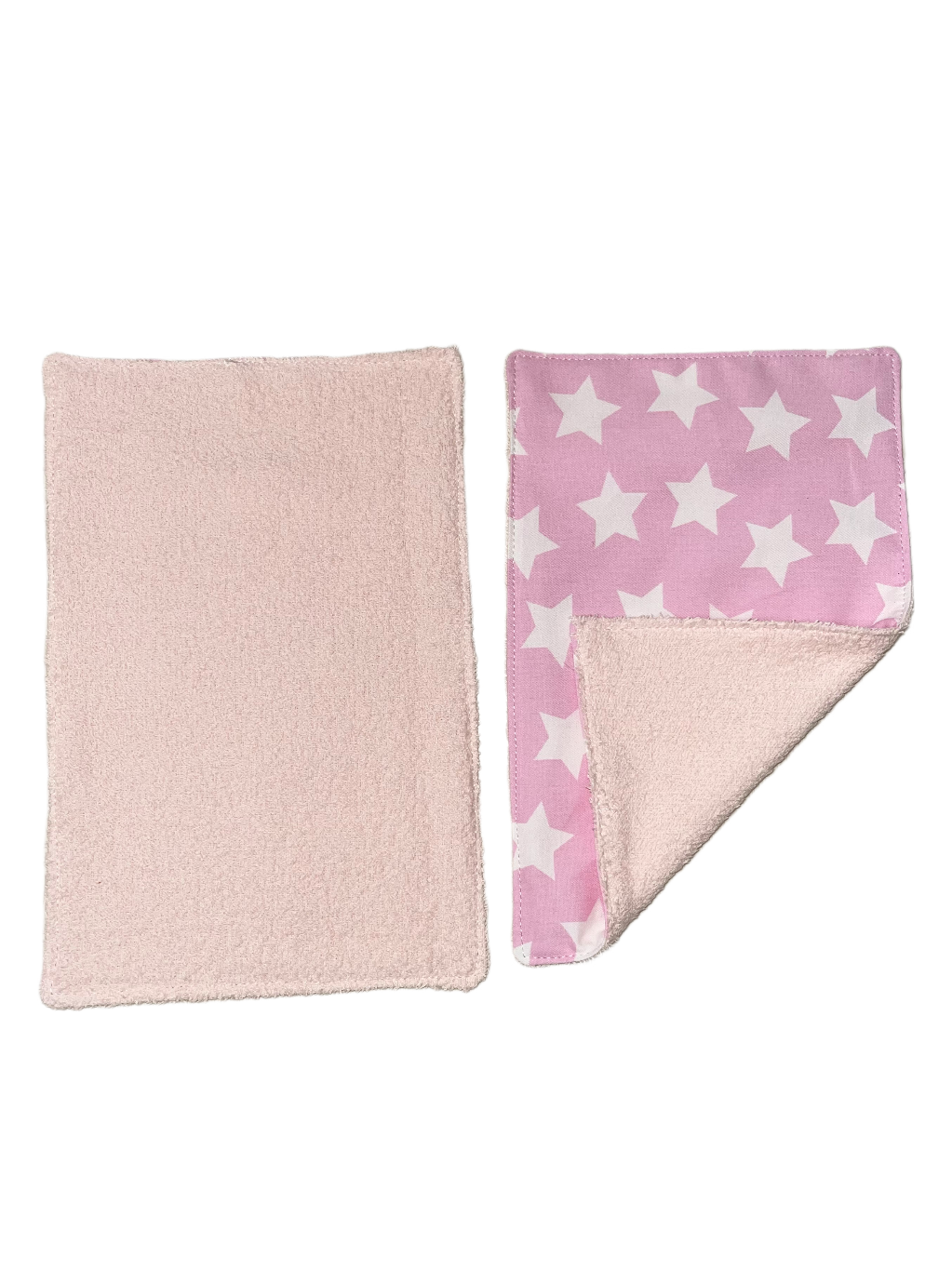 Babitas confeccionadas con 100% algodón, combinando gabardina estampada o tusor liso en el frente y toalla de algodón doble felpa en el reverso, ideales para acompañar los primeros meses del bebé.