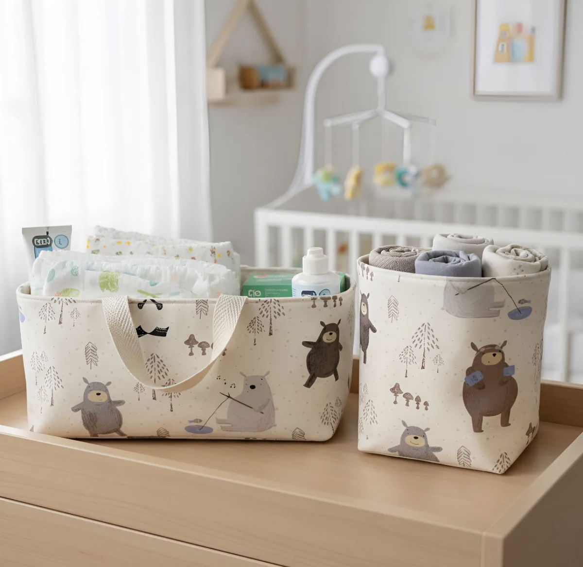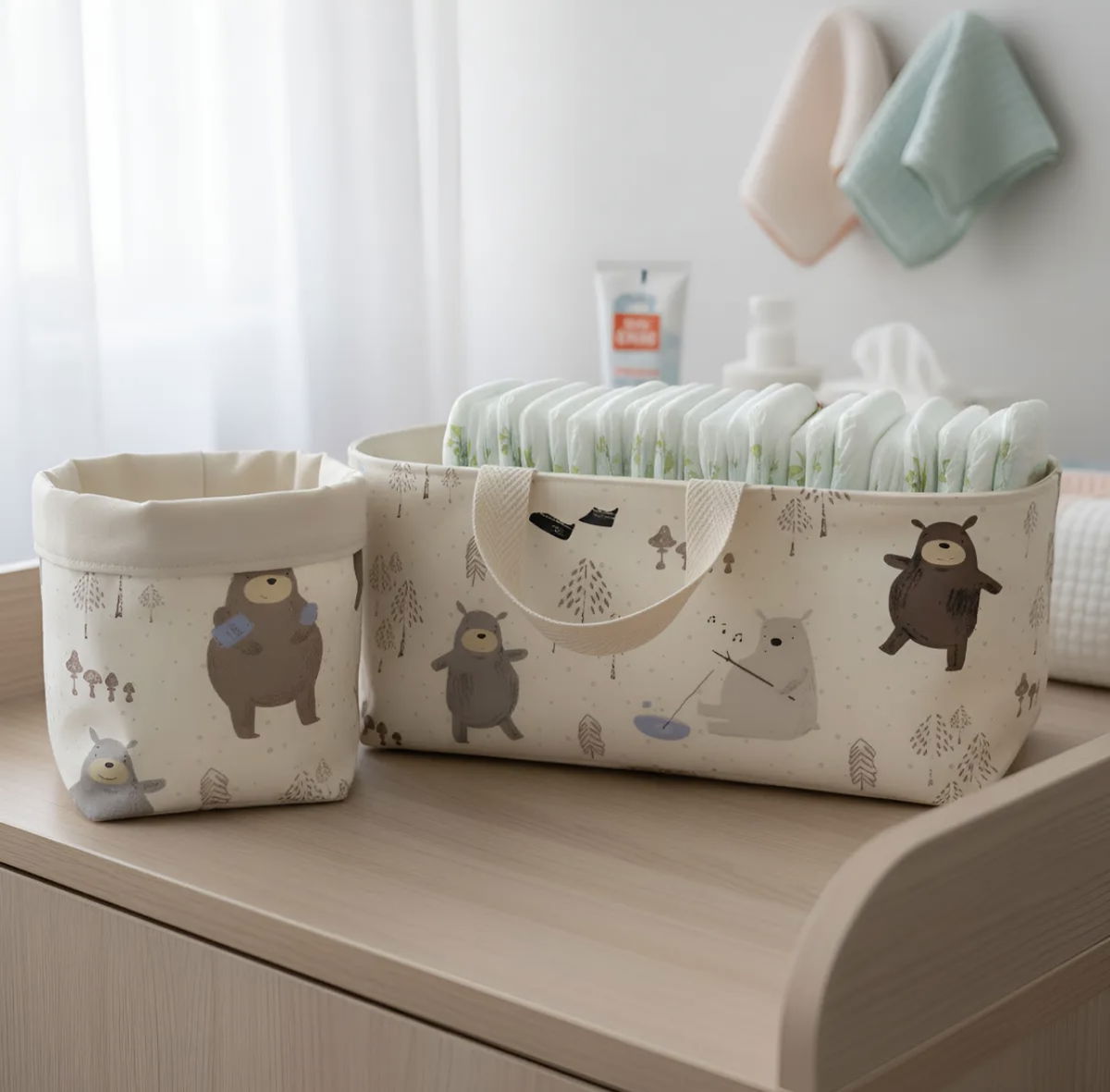 • Cesto de tela: Ideal para almacenar cremas, toallitas húmedas, talco y otros accesorios esenciales.