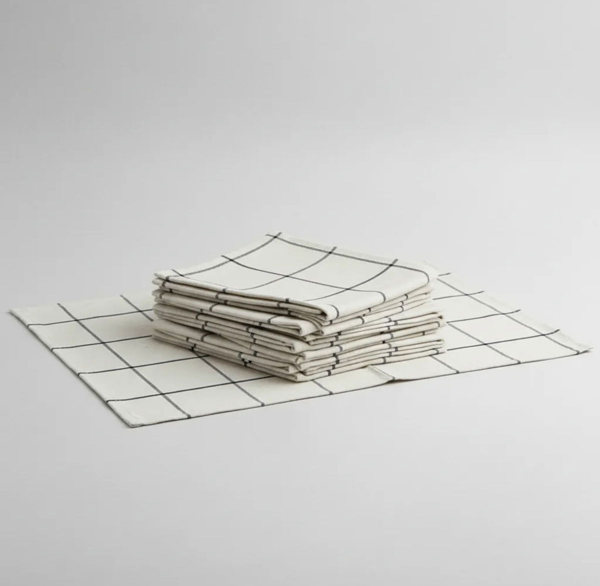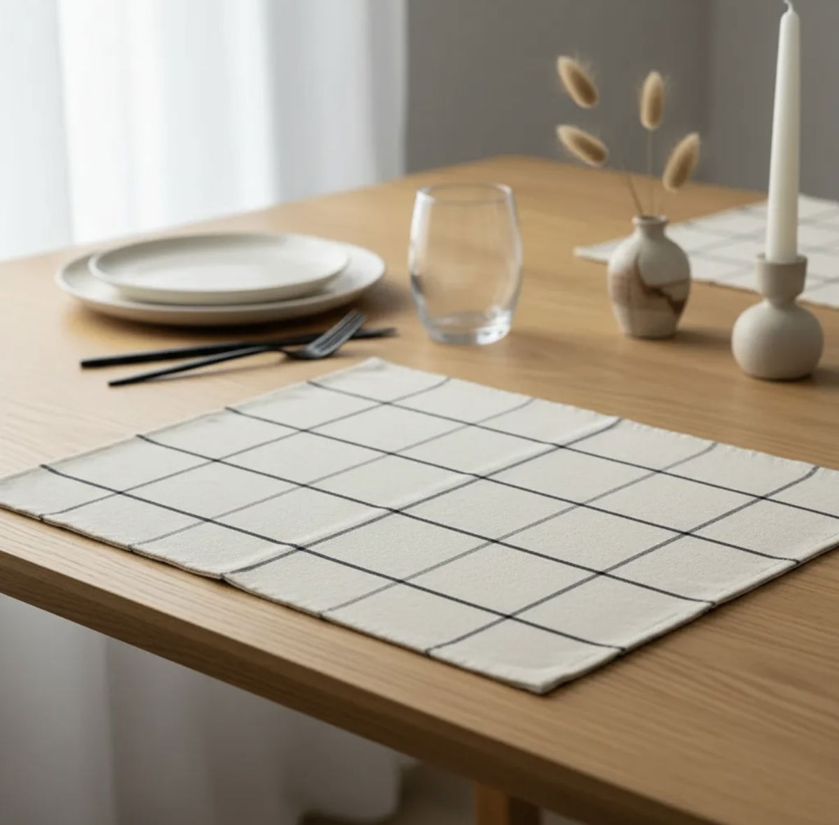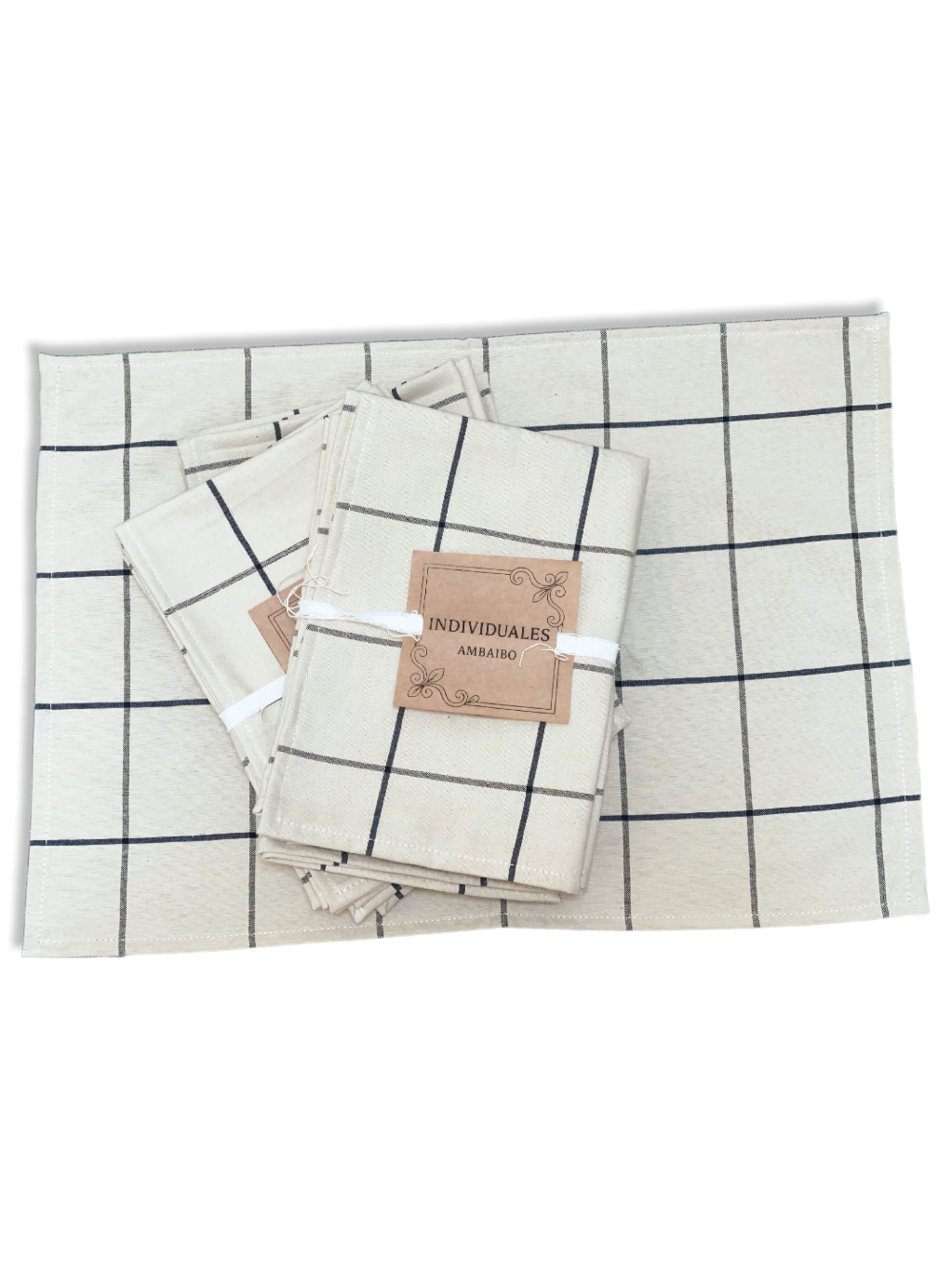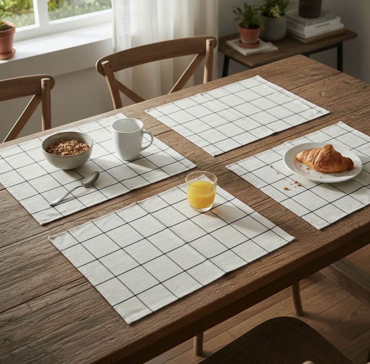 Pack de cuatro individuales confeccionados en tusor de algodón a cuadros, una tela que aporta textura, calidez y un estilo natural a la mesa.