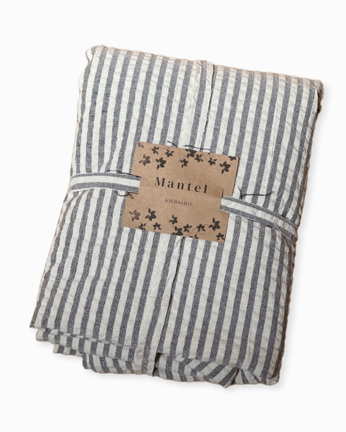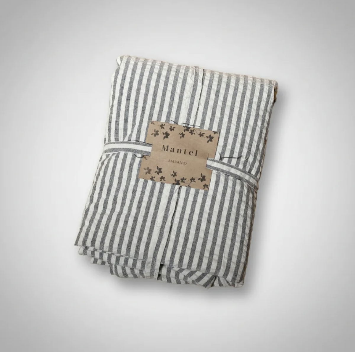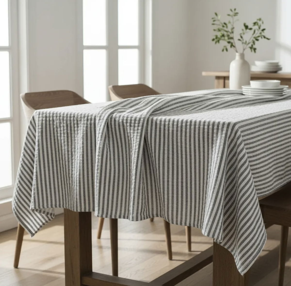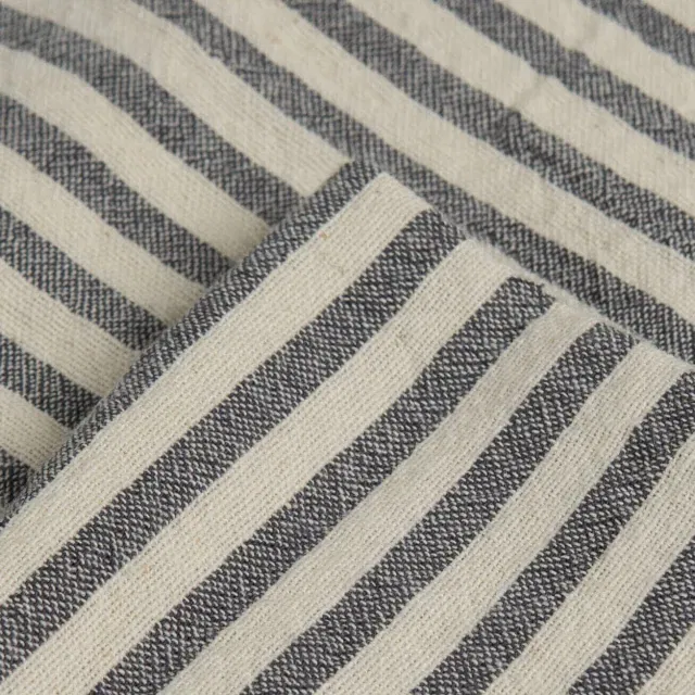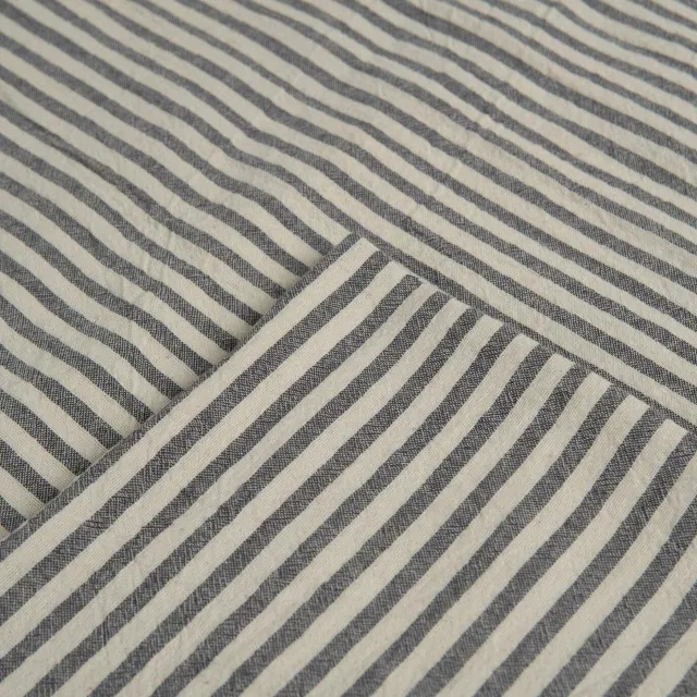 Su diseño de rayas finas gris oscuro sobre fondo crudo aporta un estilo nórdico y atemporal, ideal para vestir la mesa con un aire cálido y relajado.