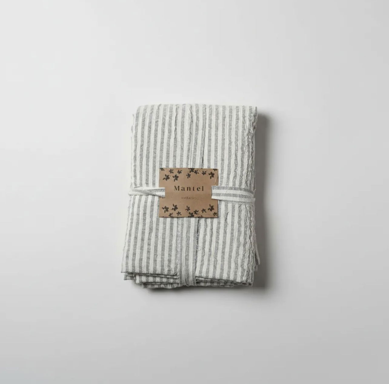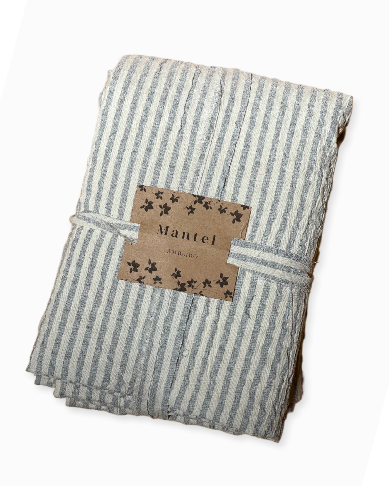 Su diseño de rayas finas gris oscuro sobre fondo crudo aporta un estilo nórdico y atemporal, ideal para vestir la mesa con un aire cálido y relajado.