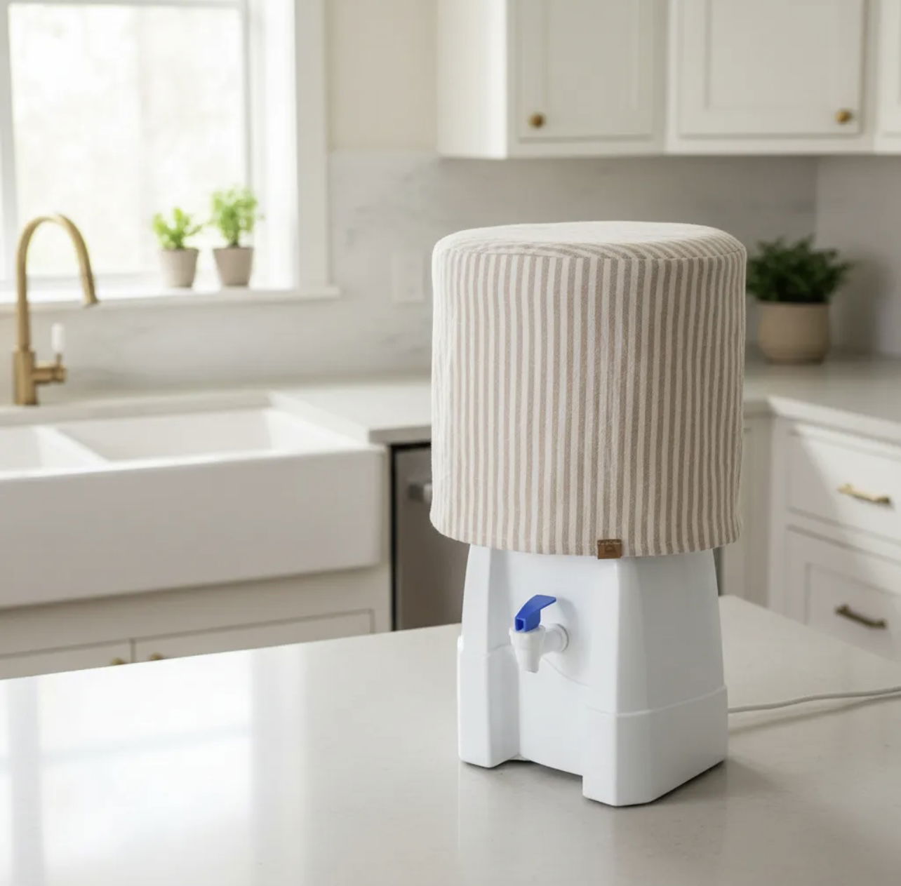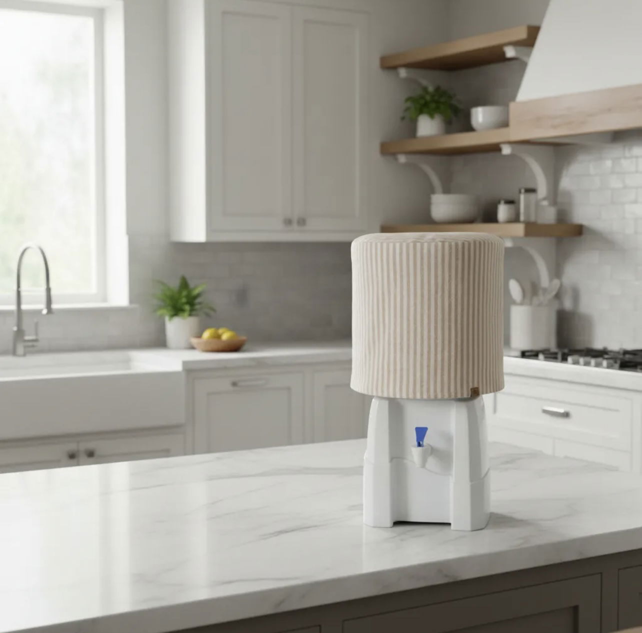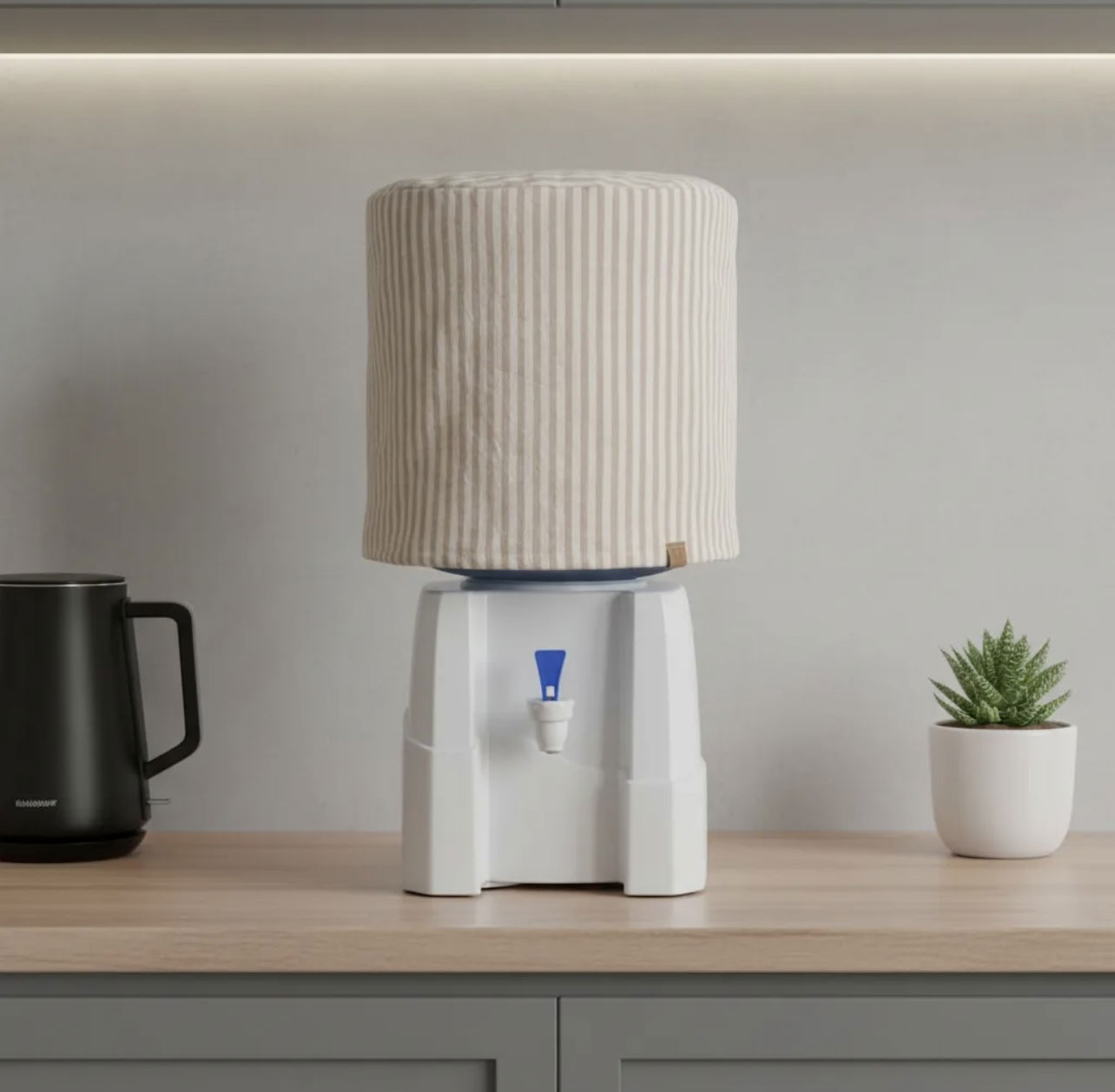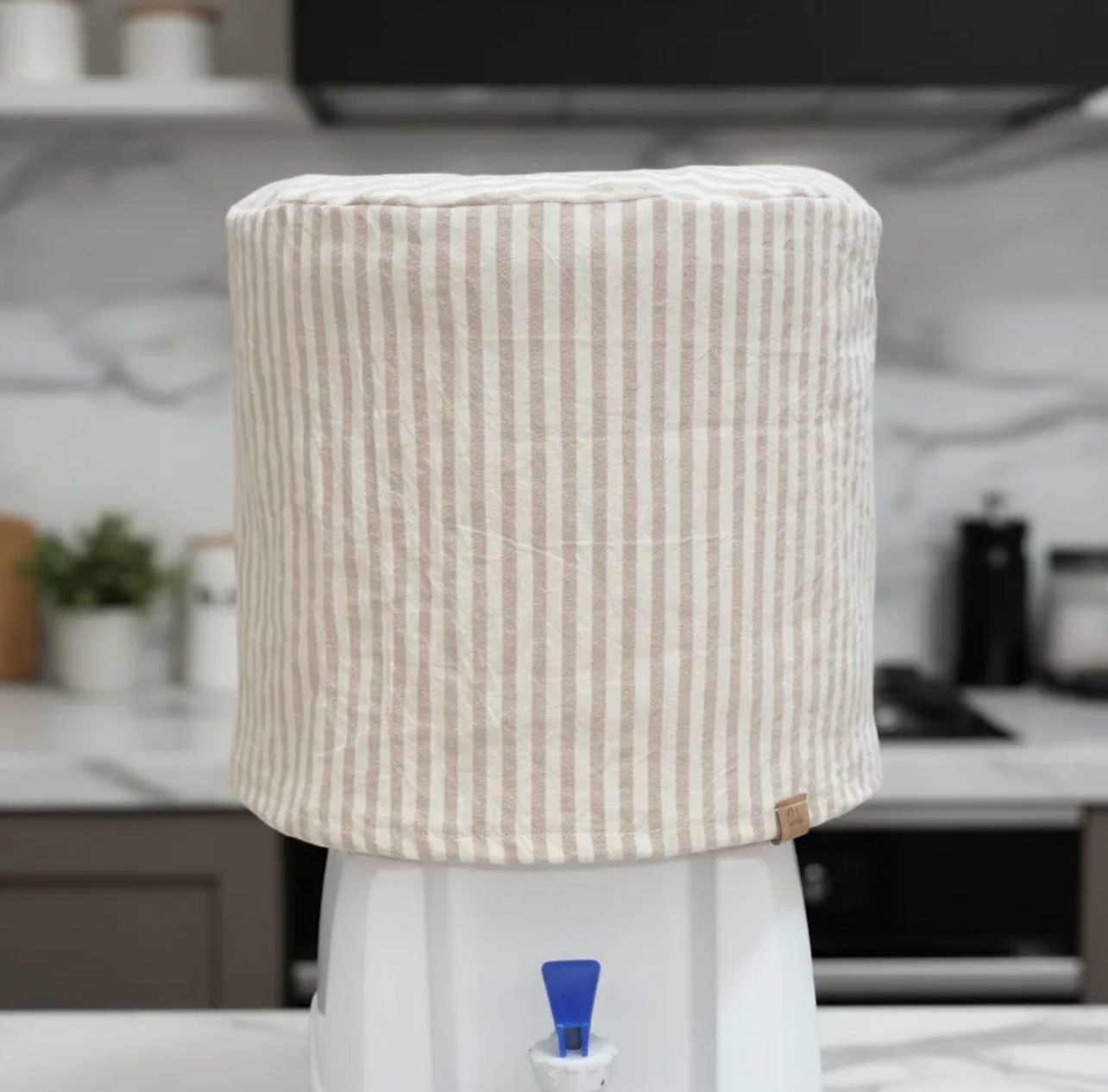 Diseñada para bidones de 12 litros, esta funda aporta calidez y estilo a los espacios del hogar. Confeccionada en tela de Tusor rayas beige, mantiene el bidón cubierto de forma prolija y decorativa, sumando un detalle simple y encantador a tu cocina o comedor.
