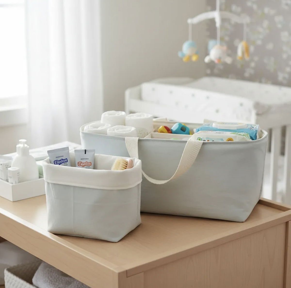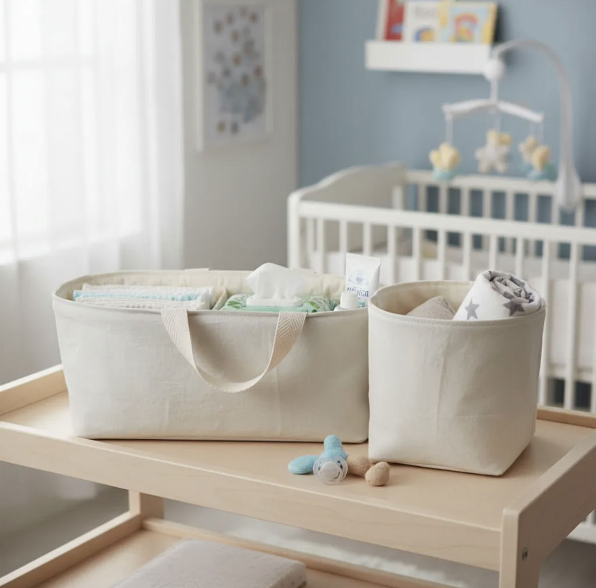 • Cesto de tela: Ideal para almacenar cremas, toallitas húmedas, talco y otros accesorios esenciales.
